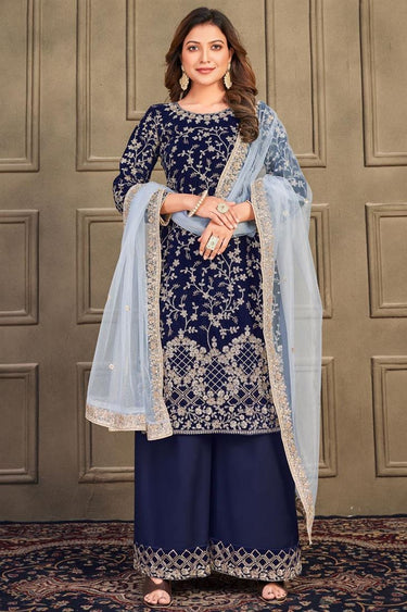 Navy Blue Color Luminous Velvet Fabric Function Wear Palazzo Suit