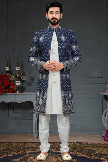 Navy Blue Color Silk Fabric Wedding Wear Readymade Indo Western For Men