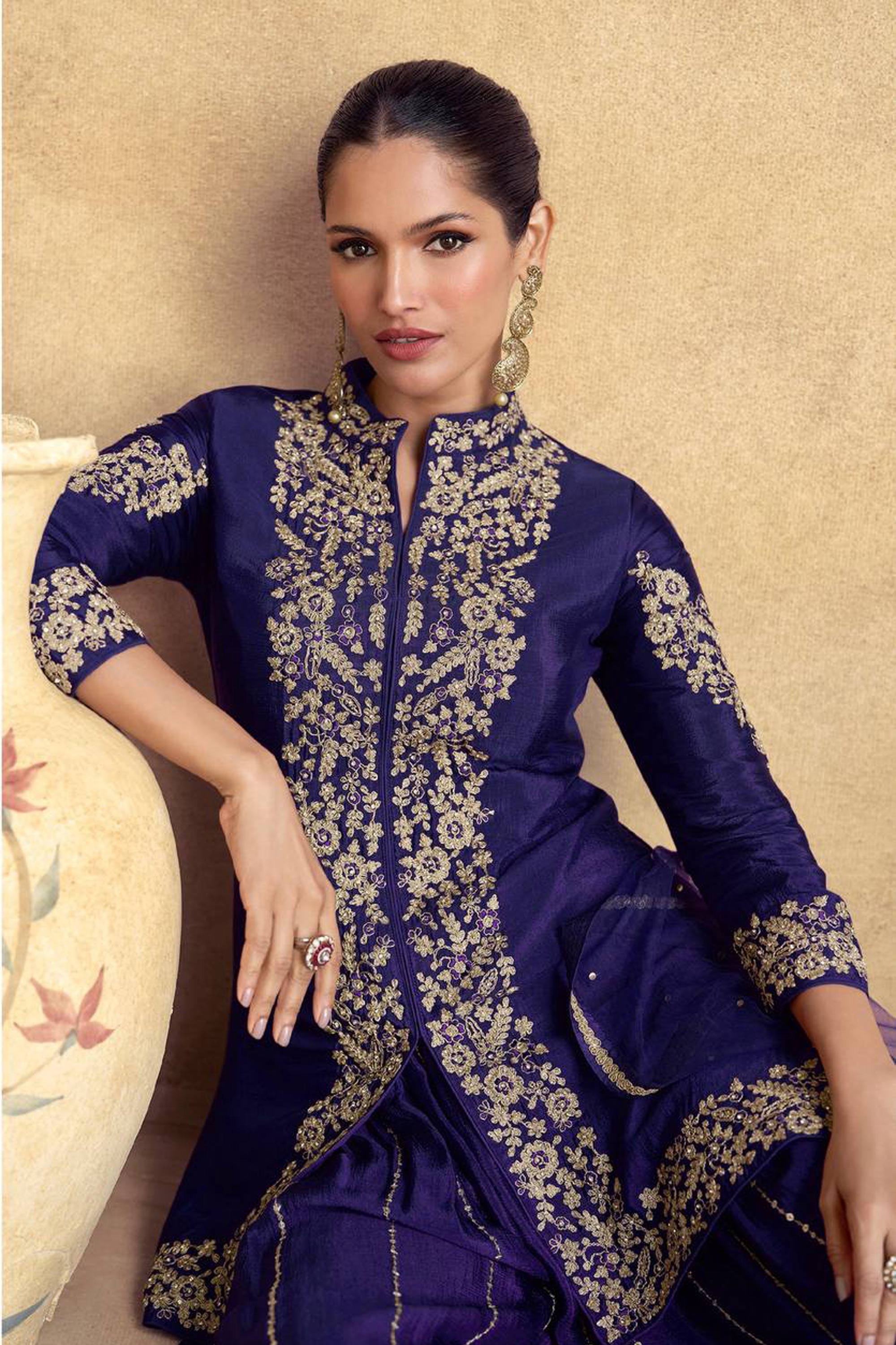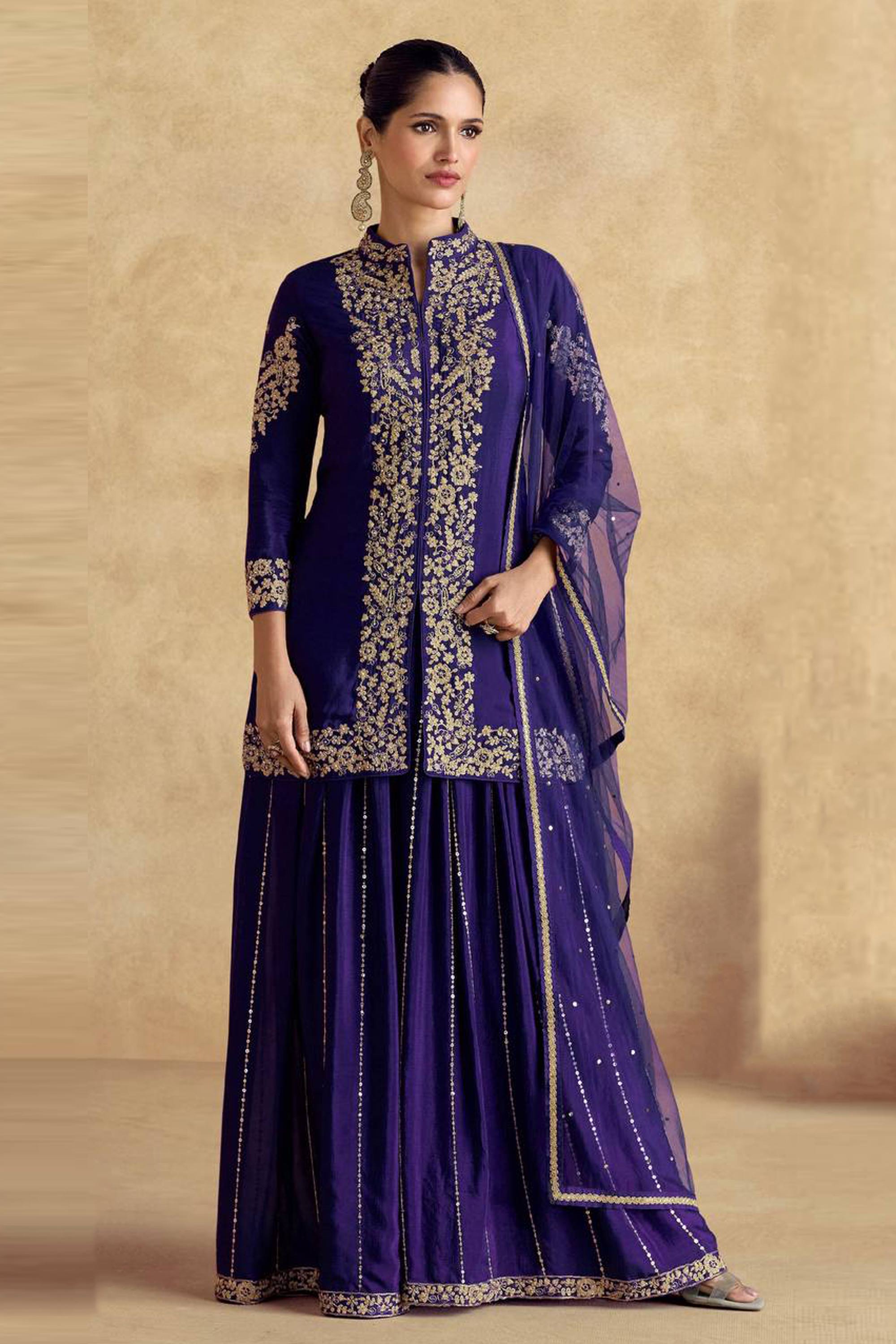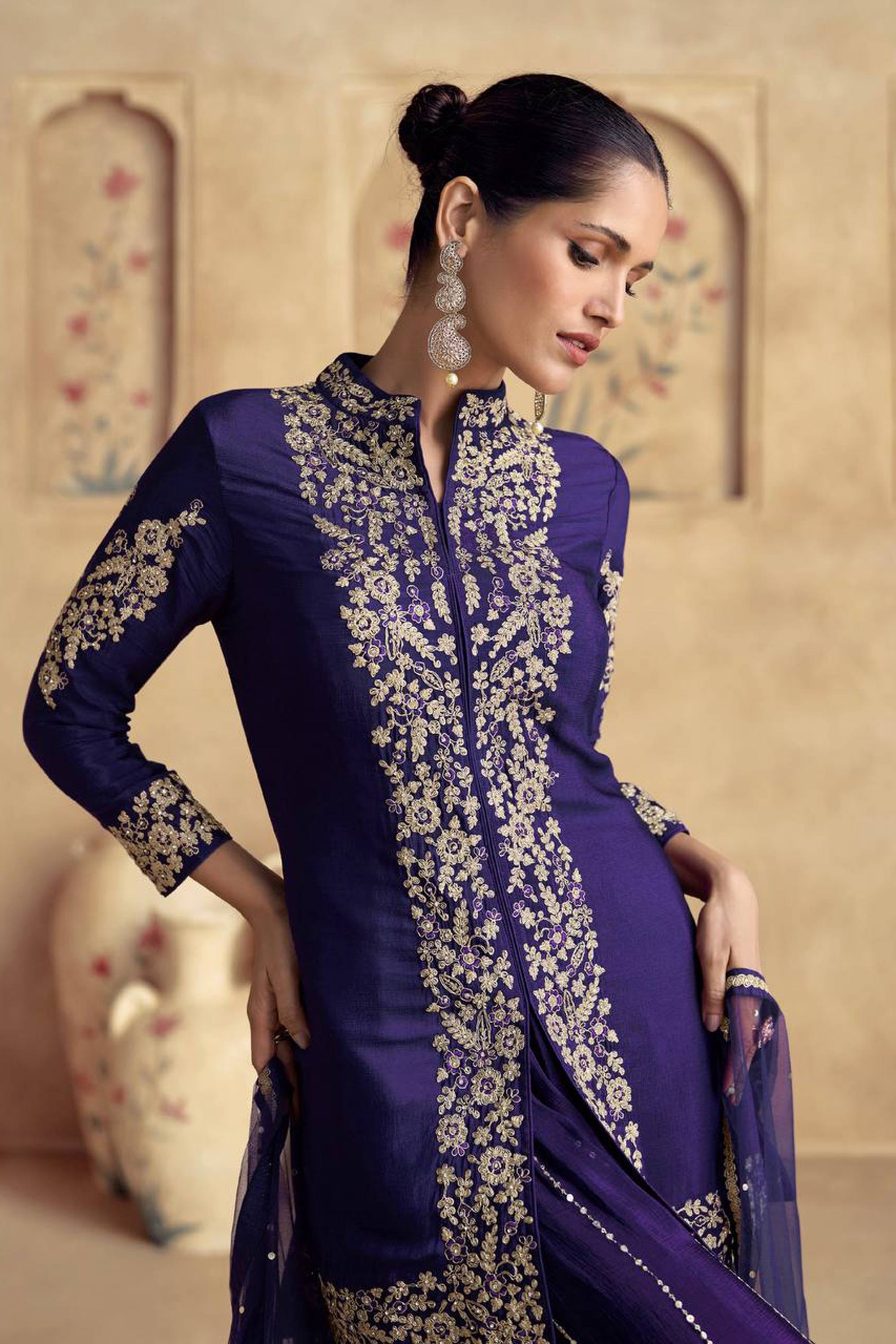 Navy Blue Festive Wear Embroidered Chinon Readymade Palazzo Suit