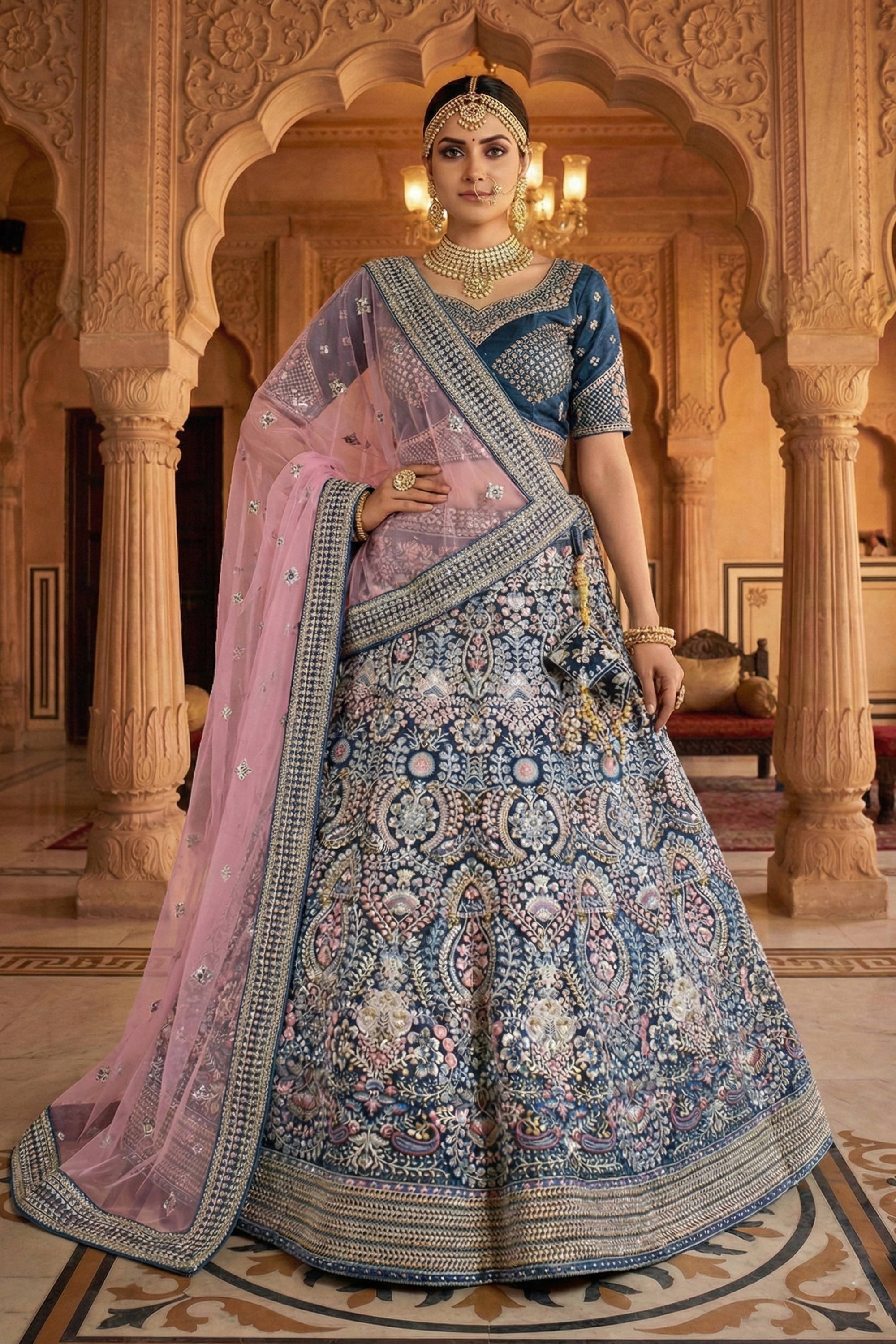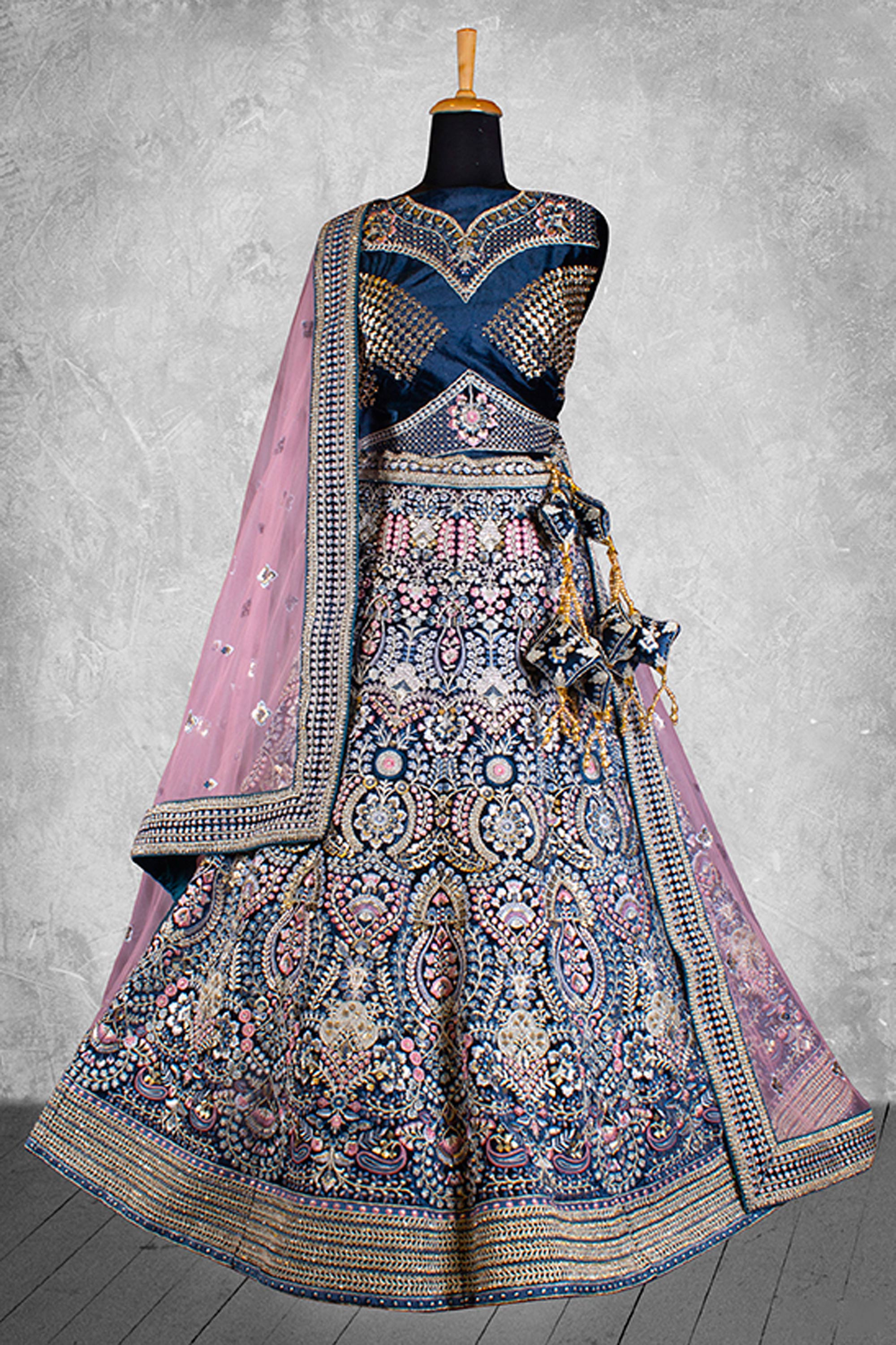 Navy Blue Velvet Heavy Embroidered Bridal Lehenga Choli