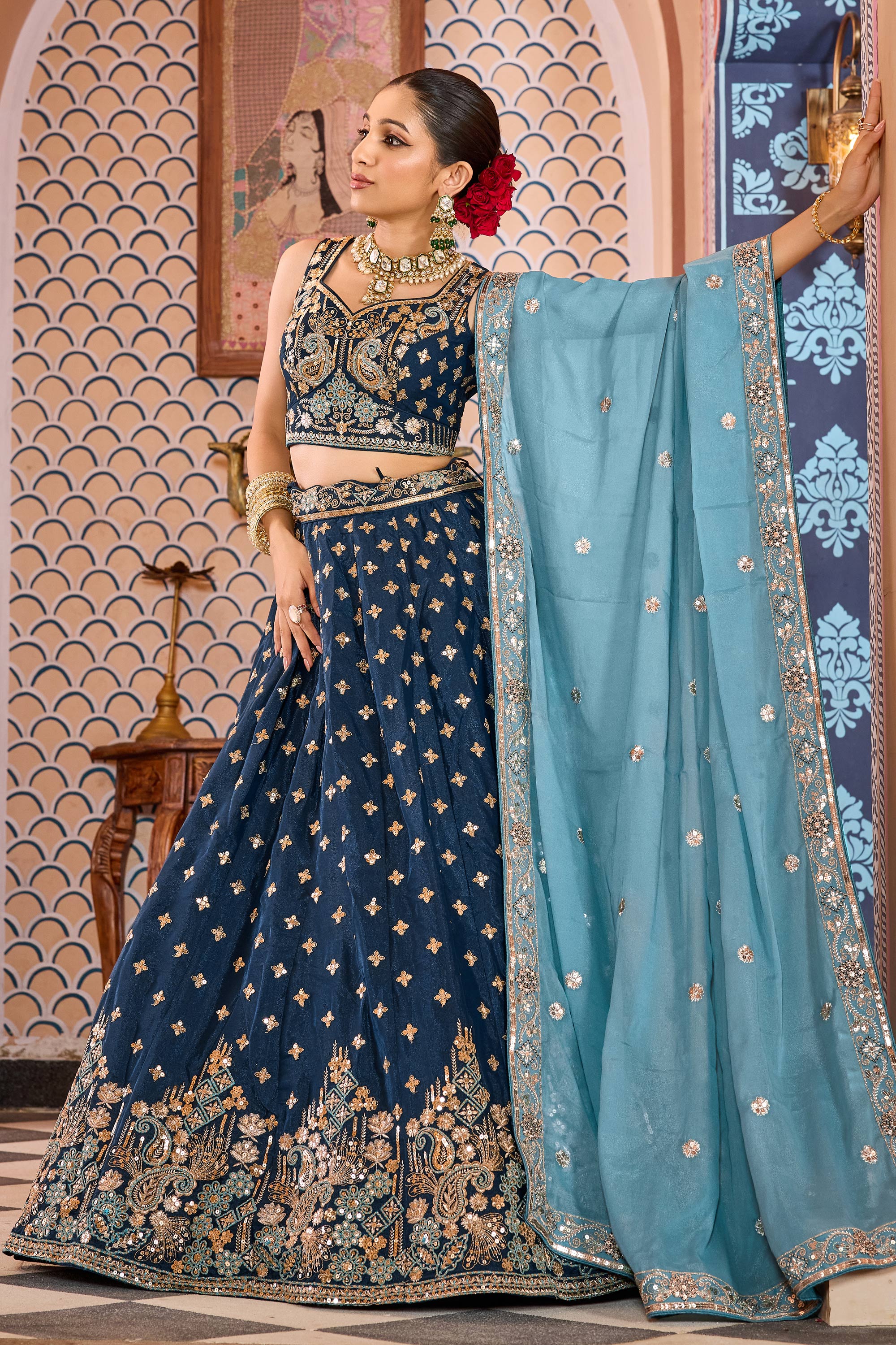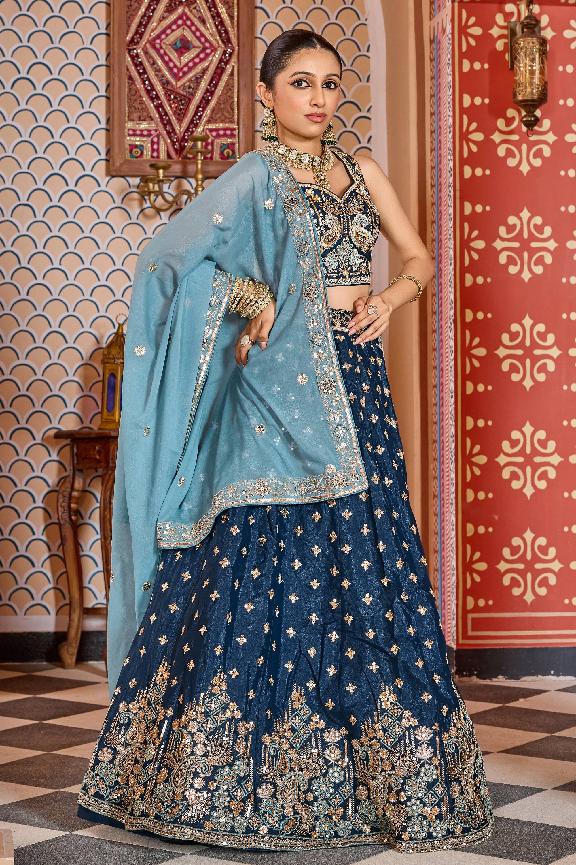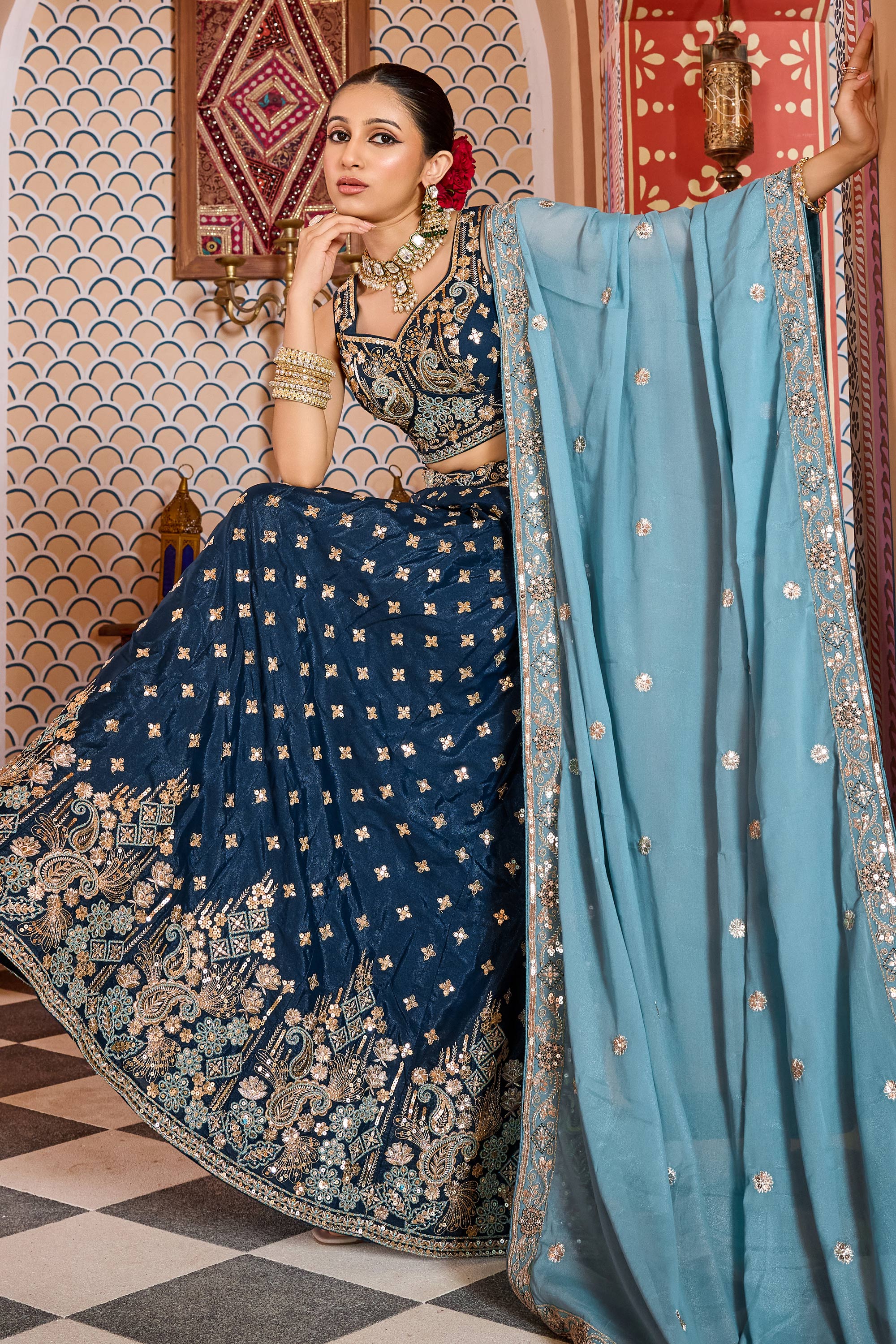 Navy Blue Wedding Tissue Silk Embroidered Lehenga Choli