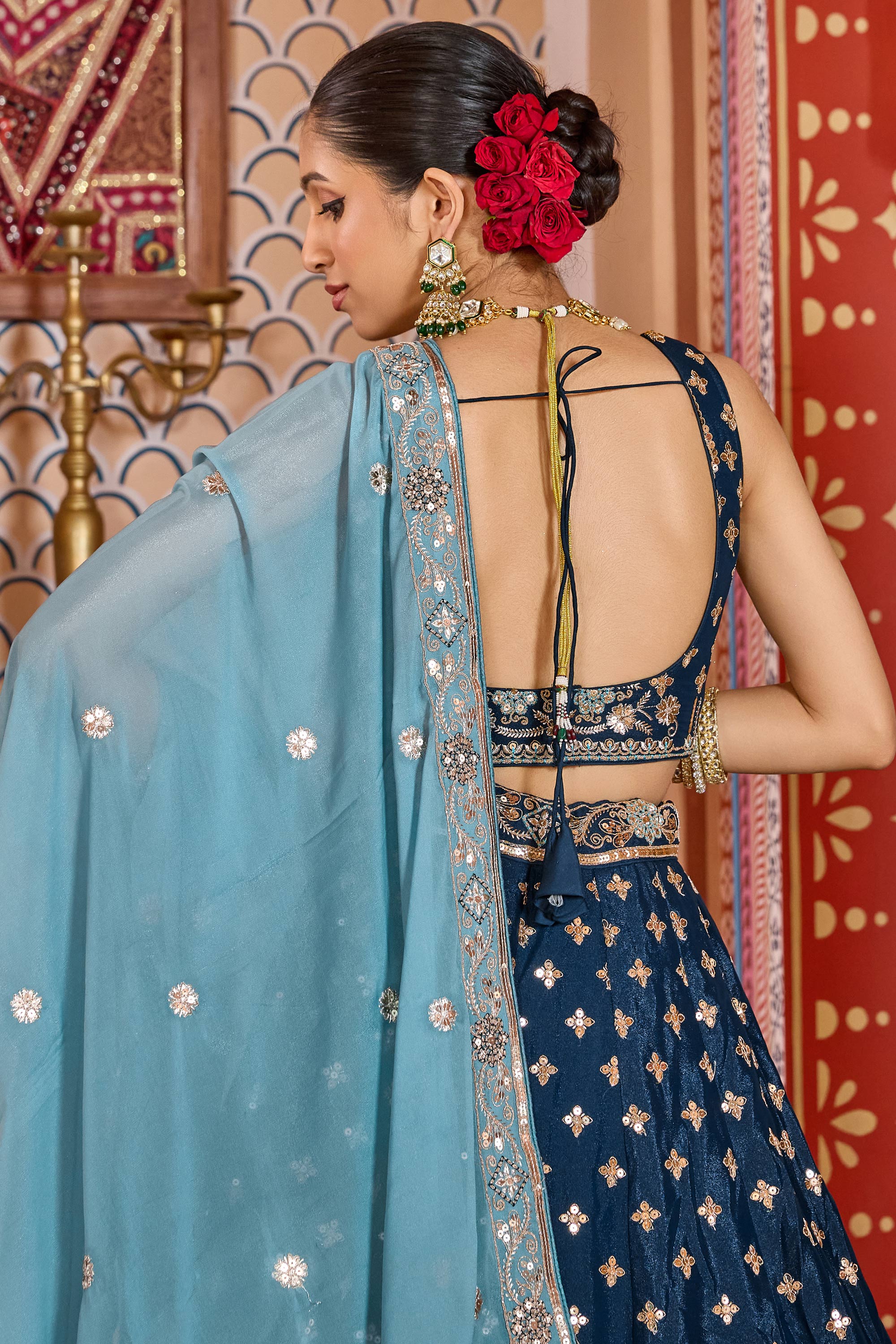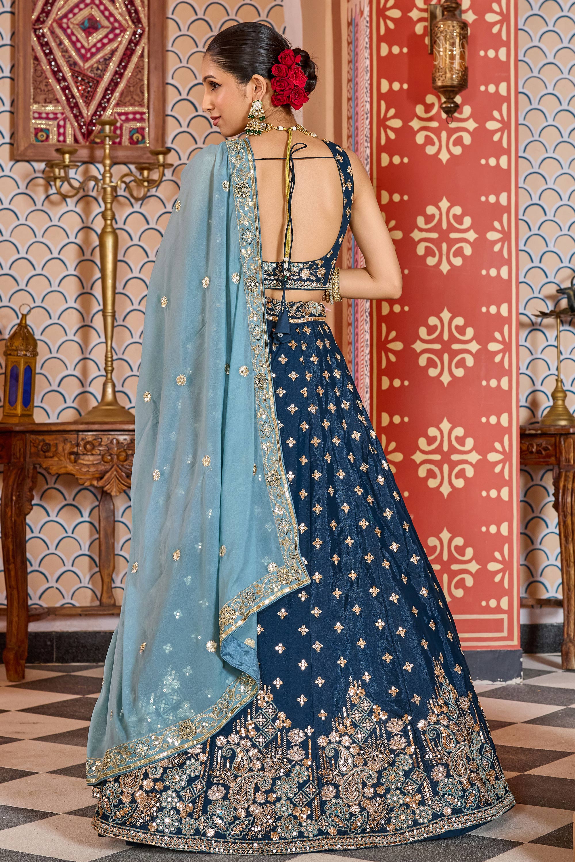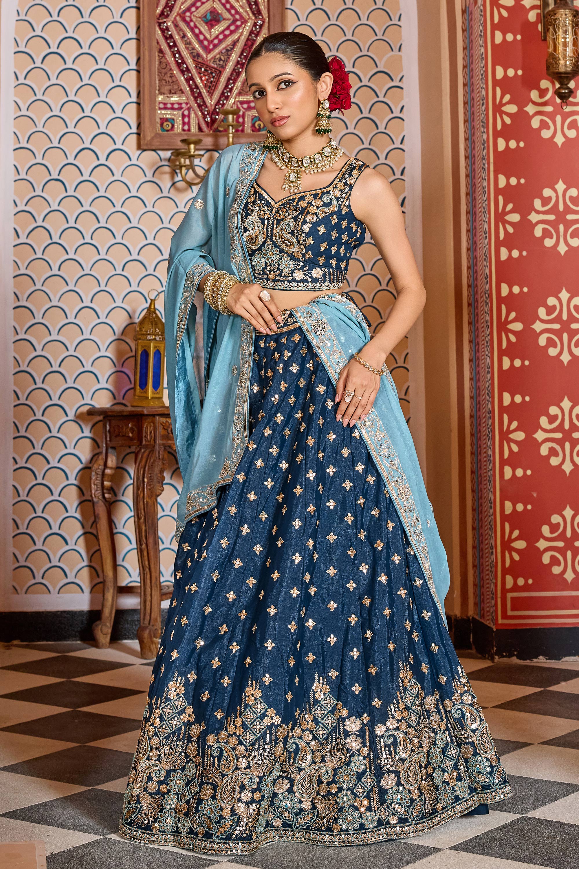 Navy Blue Wedding Tissue Silk Embroidered Lehenga Choli