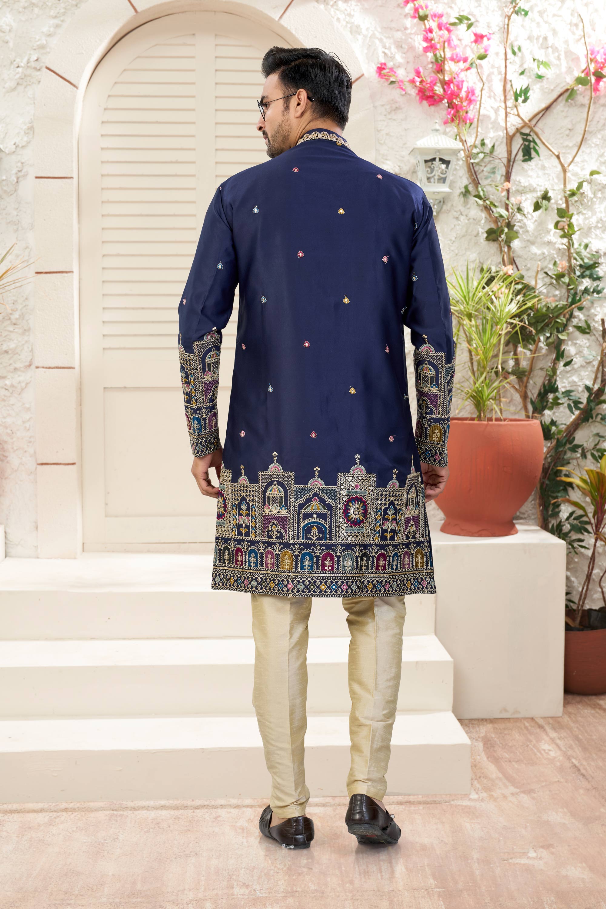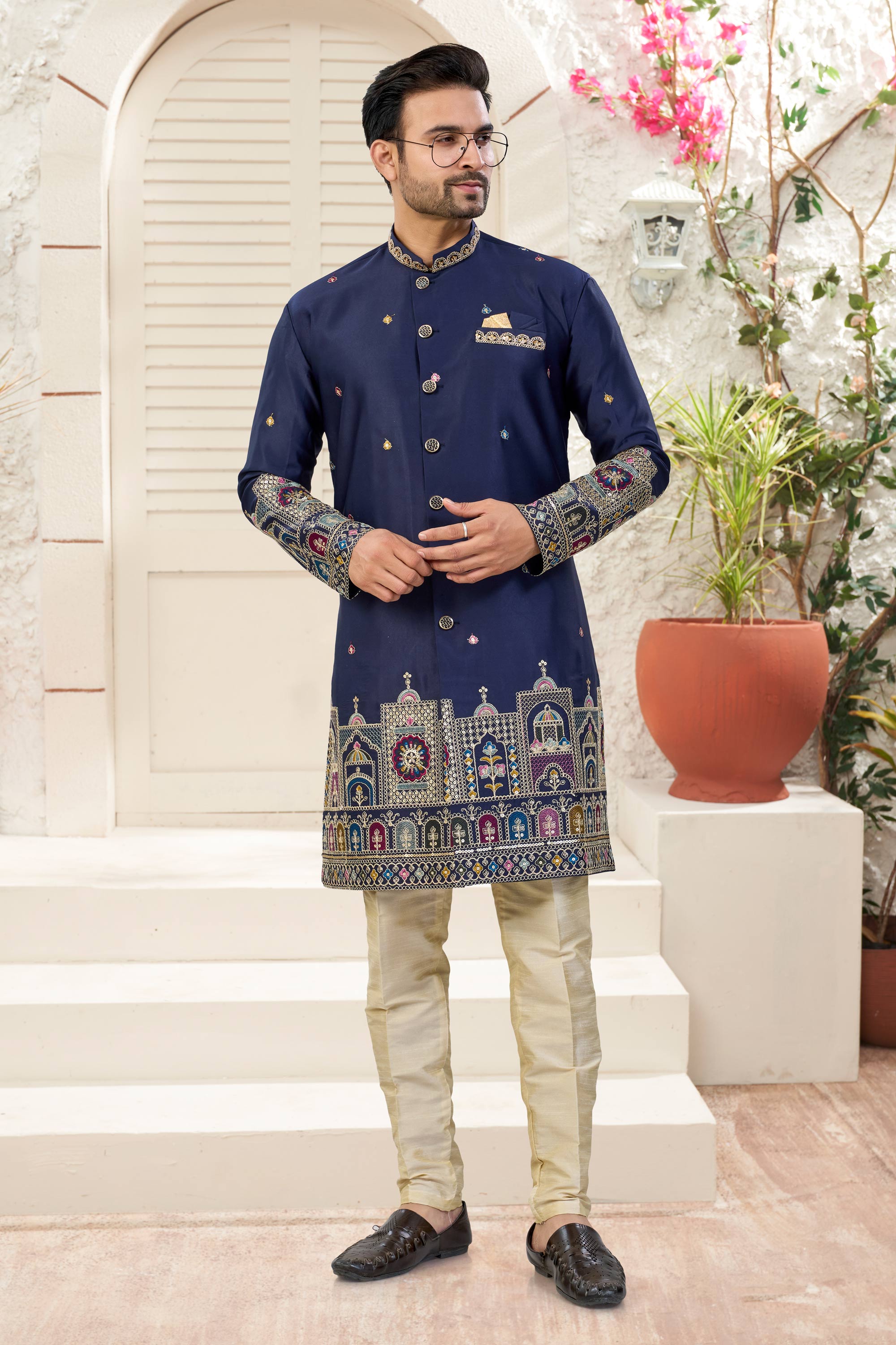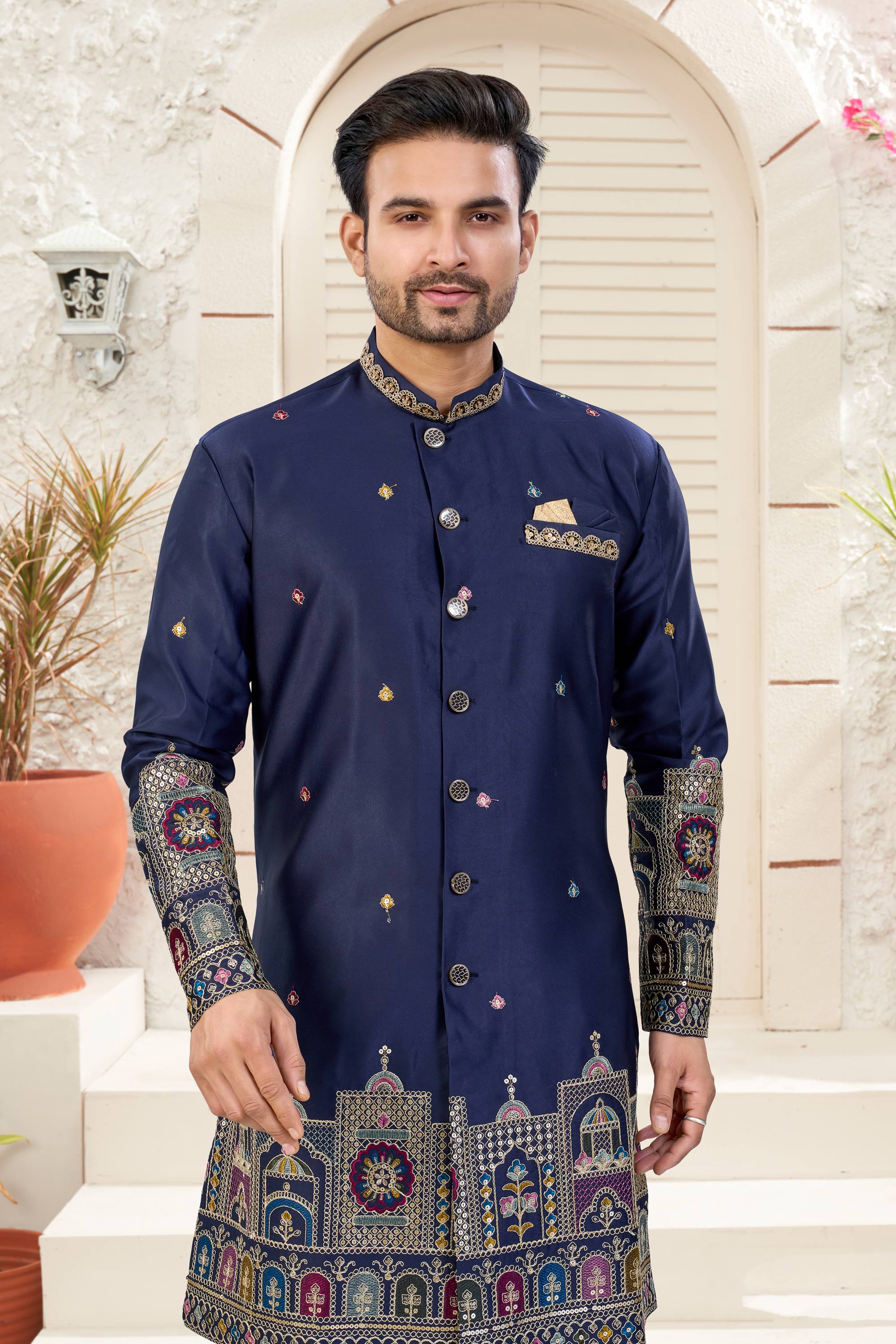 Navy Blue Wedding Wear Art Silk Readymade Indo Western For Men