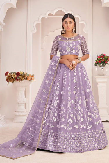 Net Fabric Fabulous Lavender Color Embroidered Lehenga