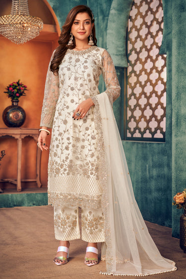 Net Fabric Fancy Embroidered Function Wear Long Straight Cut Salwar Kameez In Off White Color