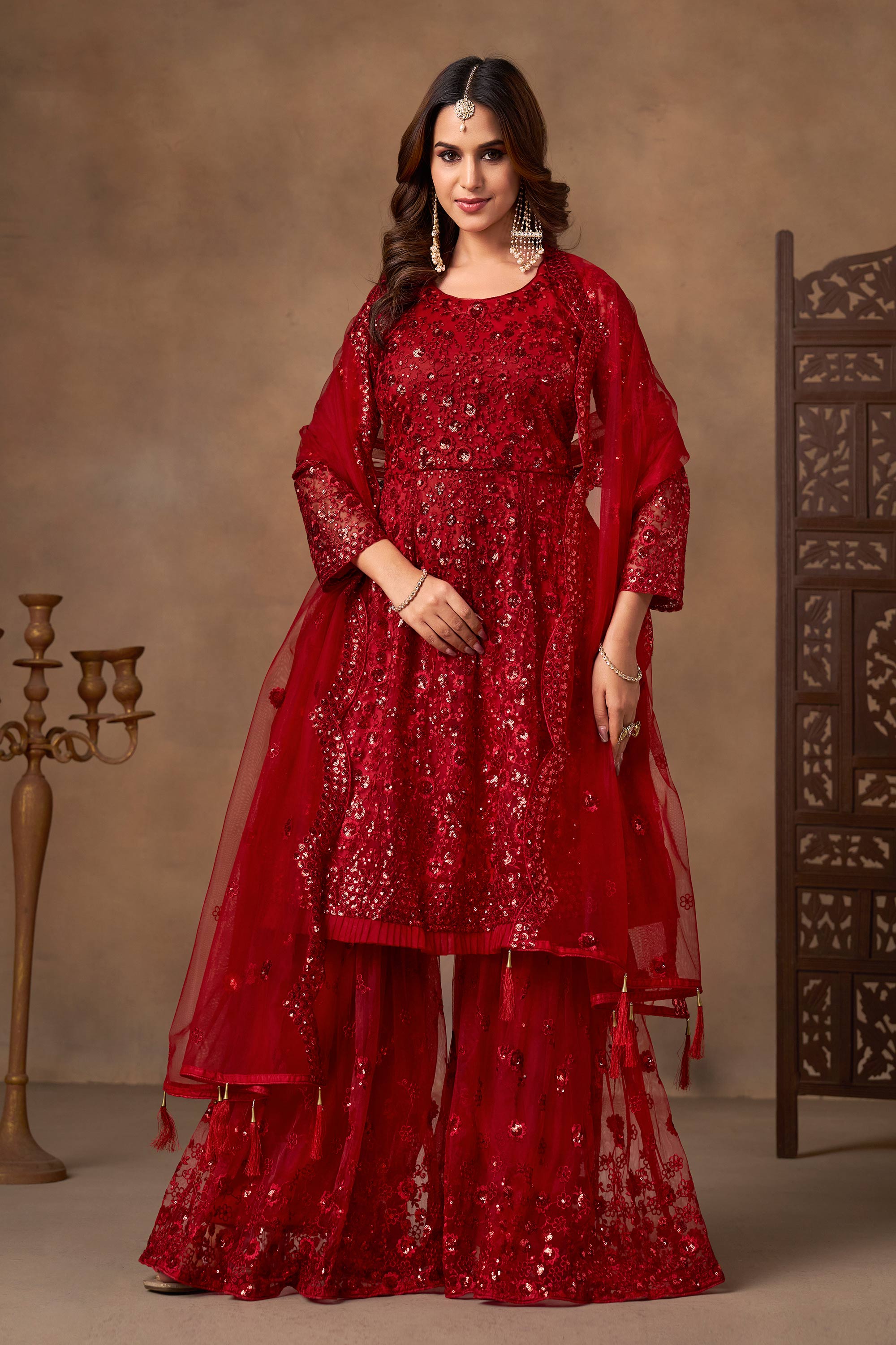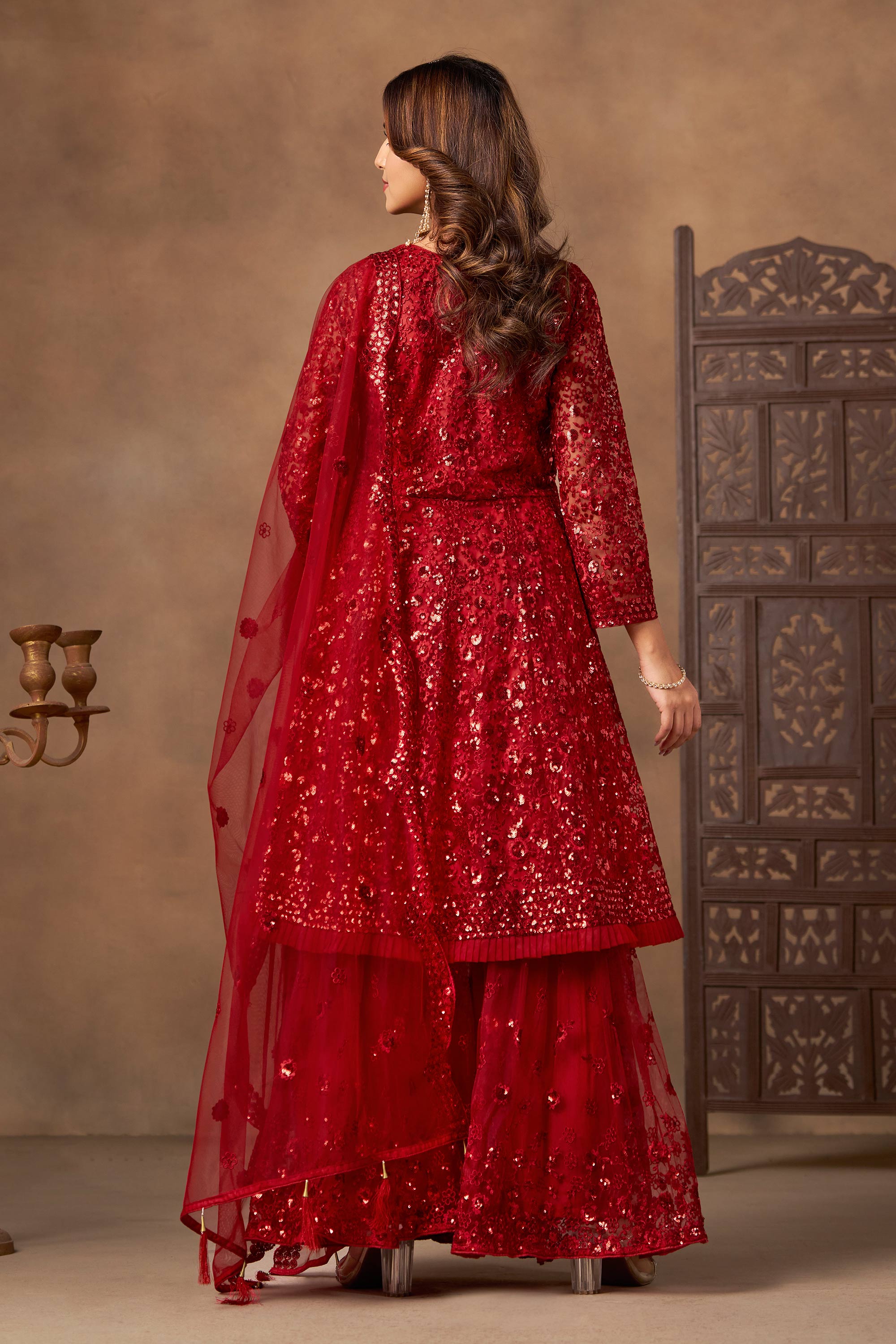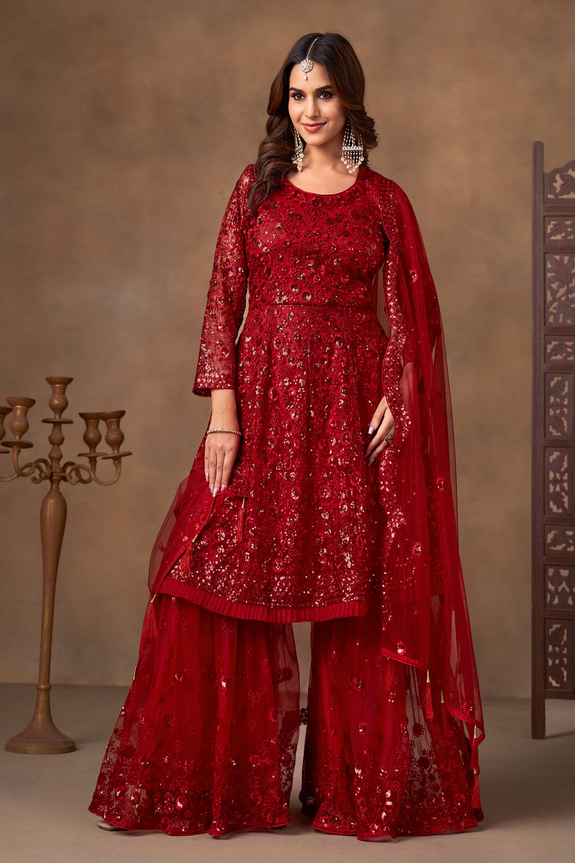 Net Sequins Embroidered Red Festive Wear Palazzo Suit With Dupatta
