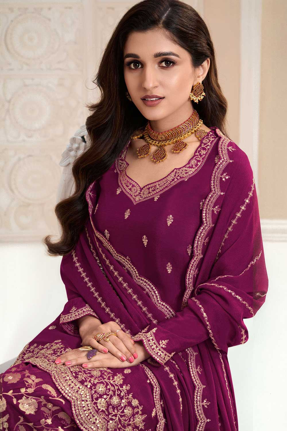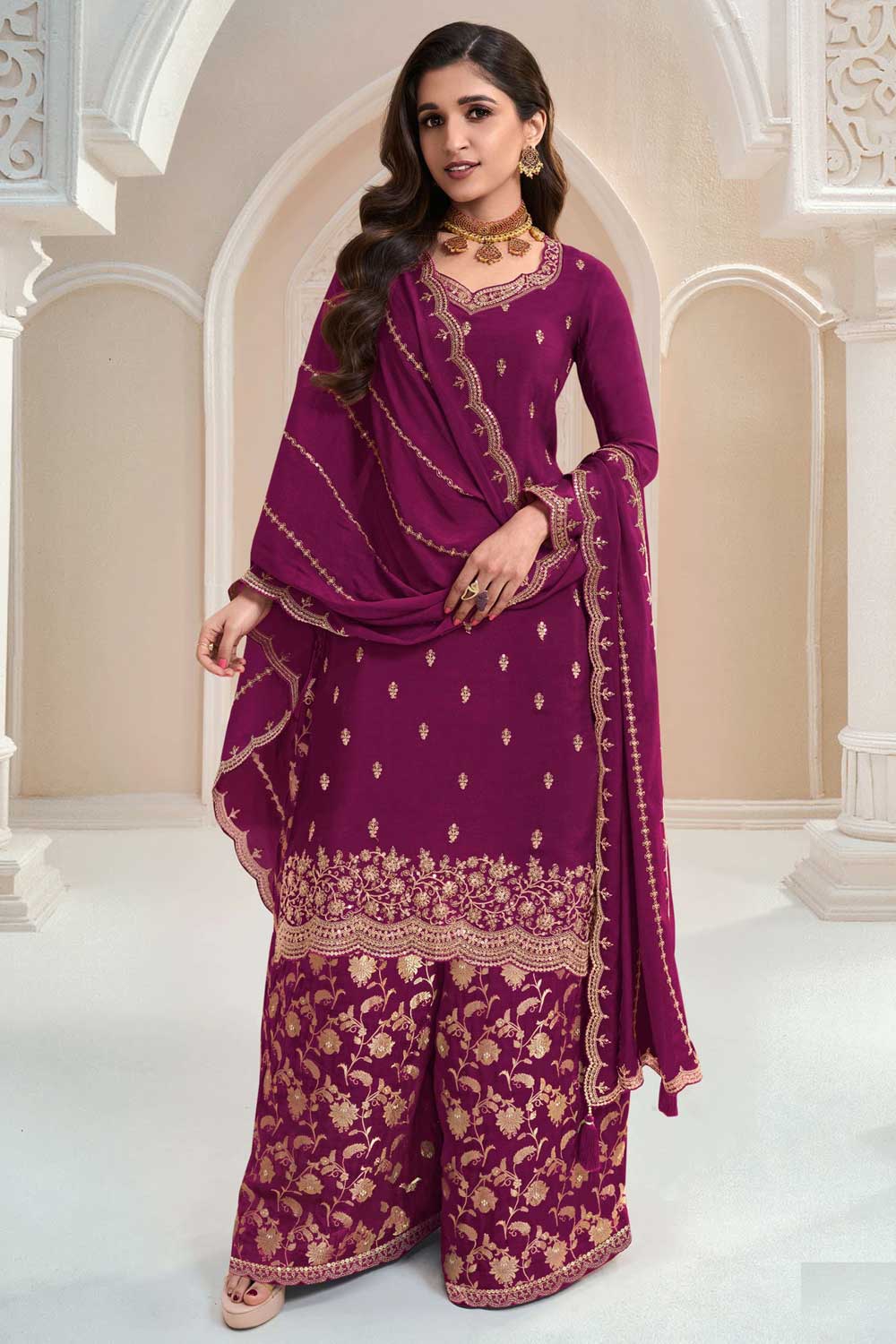 Step into the Spotlight with Celebrity Style. Turn heads at every function with this Celebrity-Style Palazzo Suit inspired by the ever-elegant Nidhi Shah. Crafted from luxurious Chinon fabric for the top, bottom, and dupatta, this ensemble drapes like a dream and moves with grace. Intricately adorned with woven designer embroidery work, it strikes the perfect balance between contemporary flair and traditional charm. Whether you're attending a festive celebration or a glamorous evening affair, this outfit ensures you own the moment, just like a star. Slight color variation may occur due to digital photography