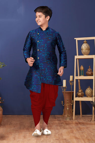 Occasion Wear Navy Blue Color Jacquard Silk Fabric Readymade Boys Indo Western
