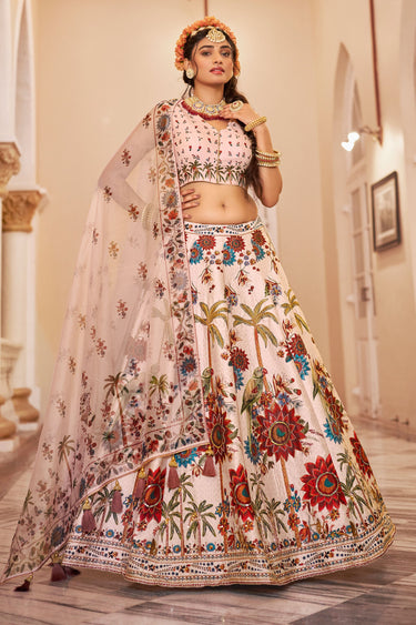 Off White Art Silk Printed Hand Work Lehenga Choli