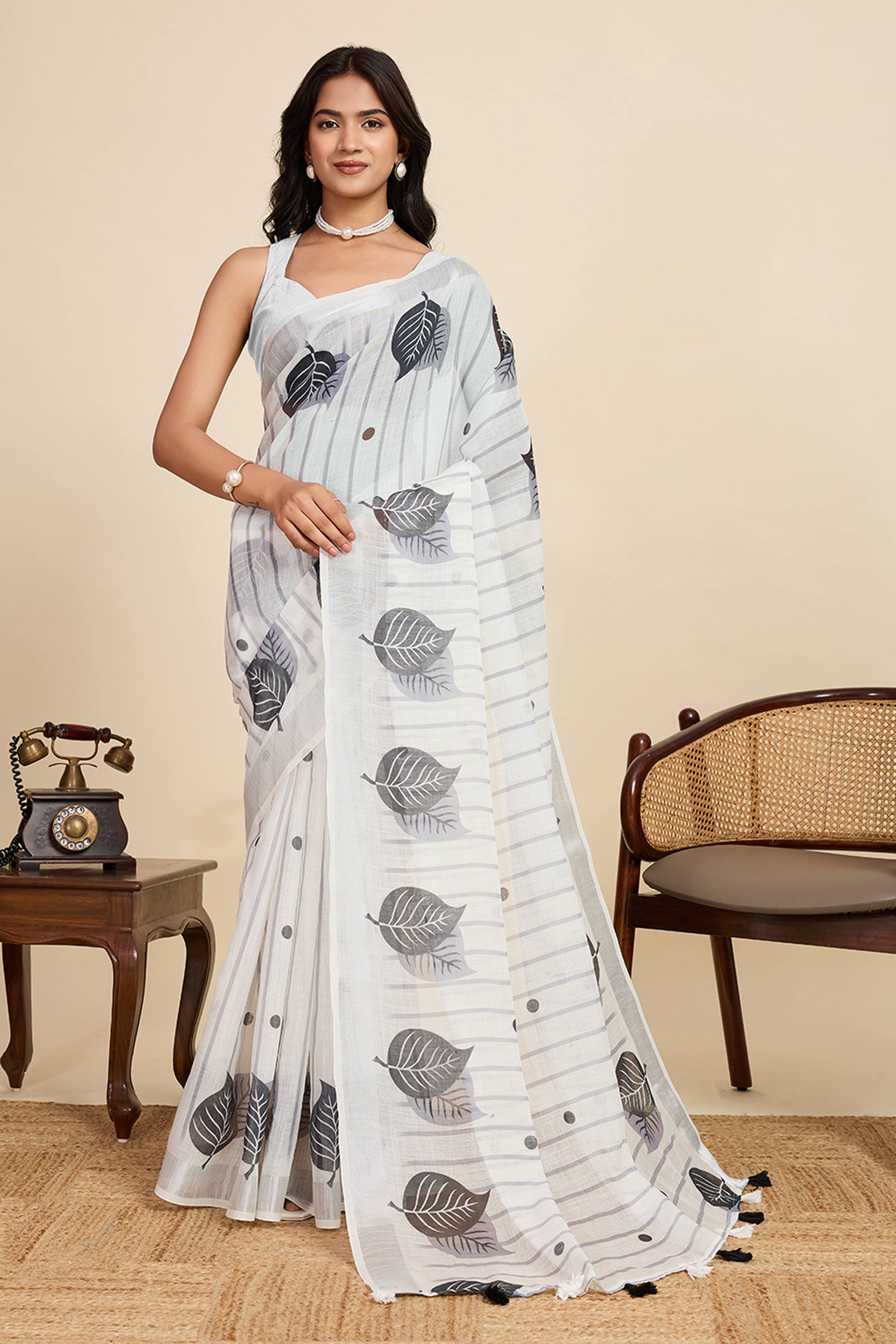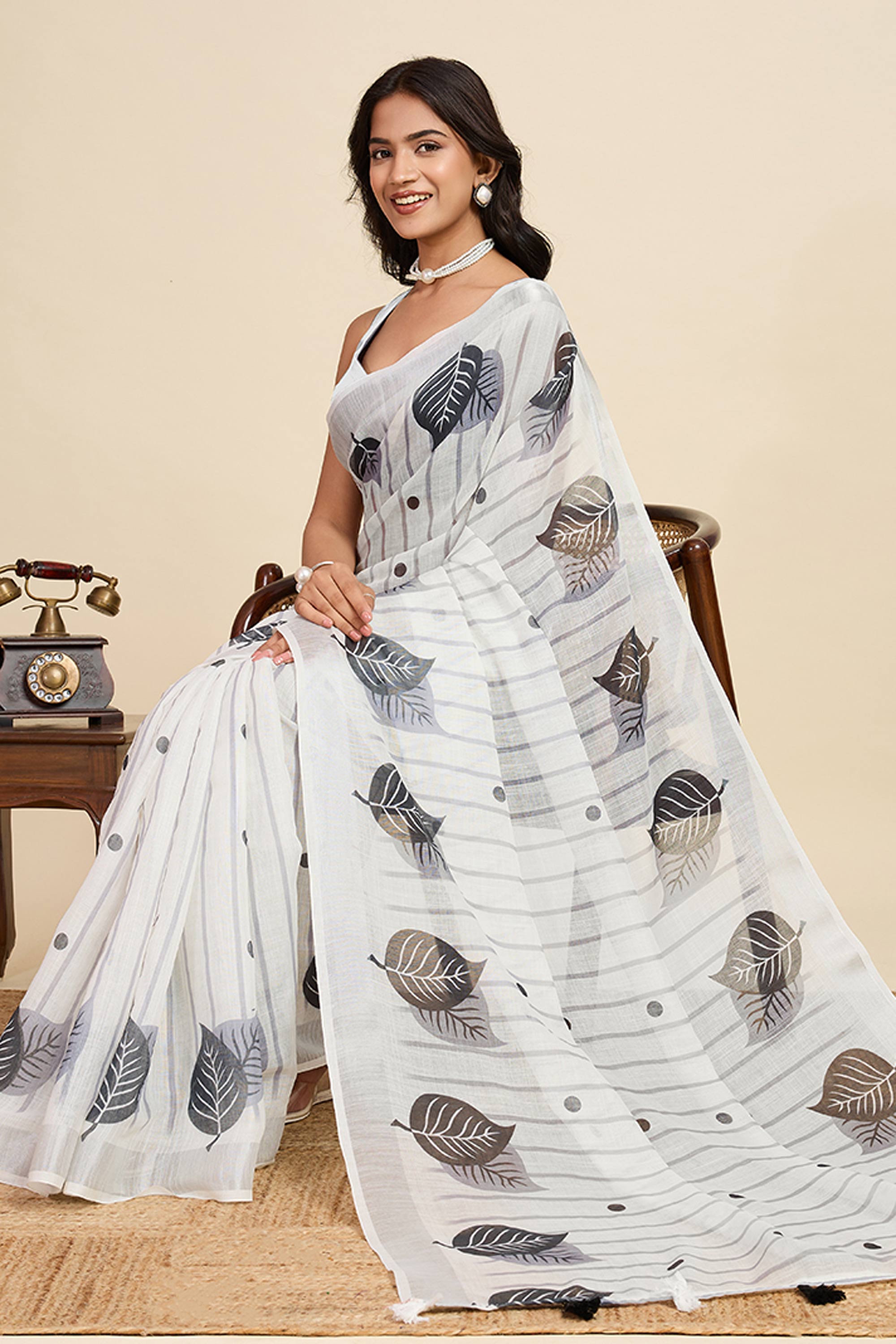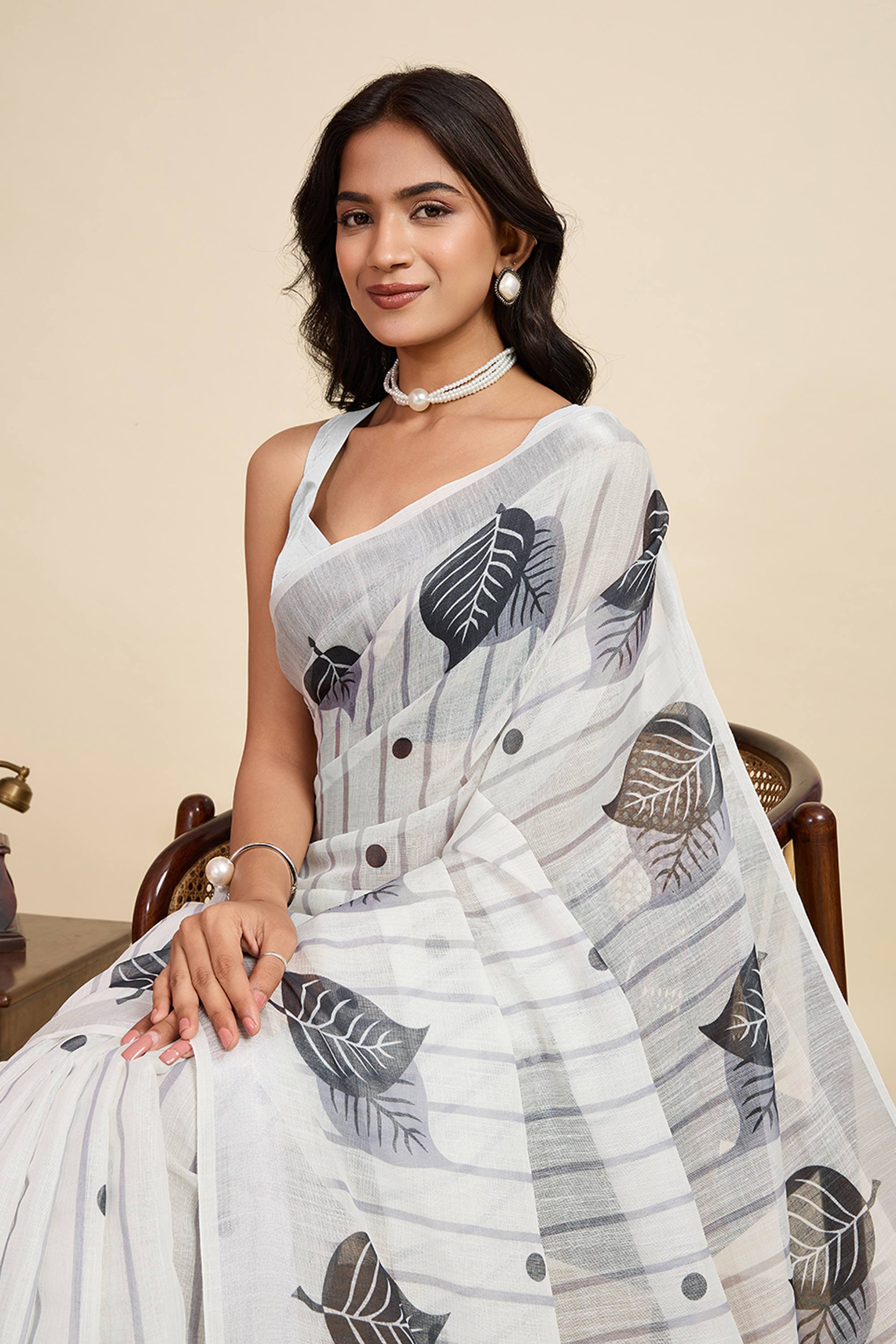 Off White Casual Wear Linen Digital Printed Saree