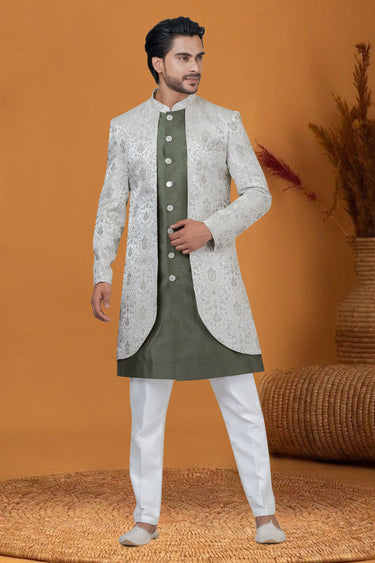 Olive Color Jacquard Work Engaging Jacquard Silk Fabric Sangeet Wear Readymade Indo Western For Men
