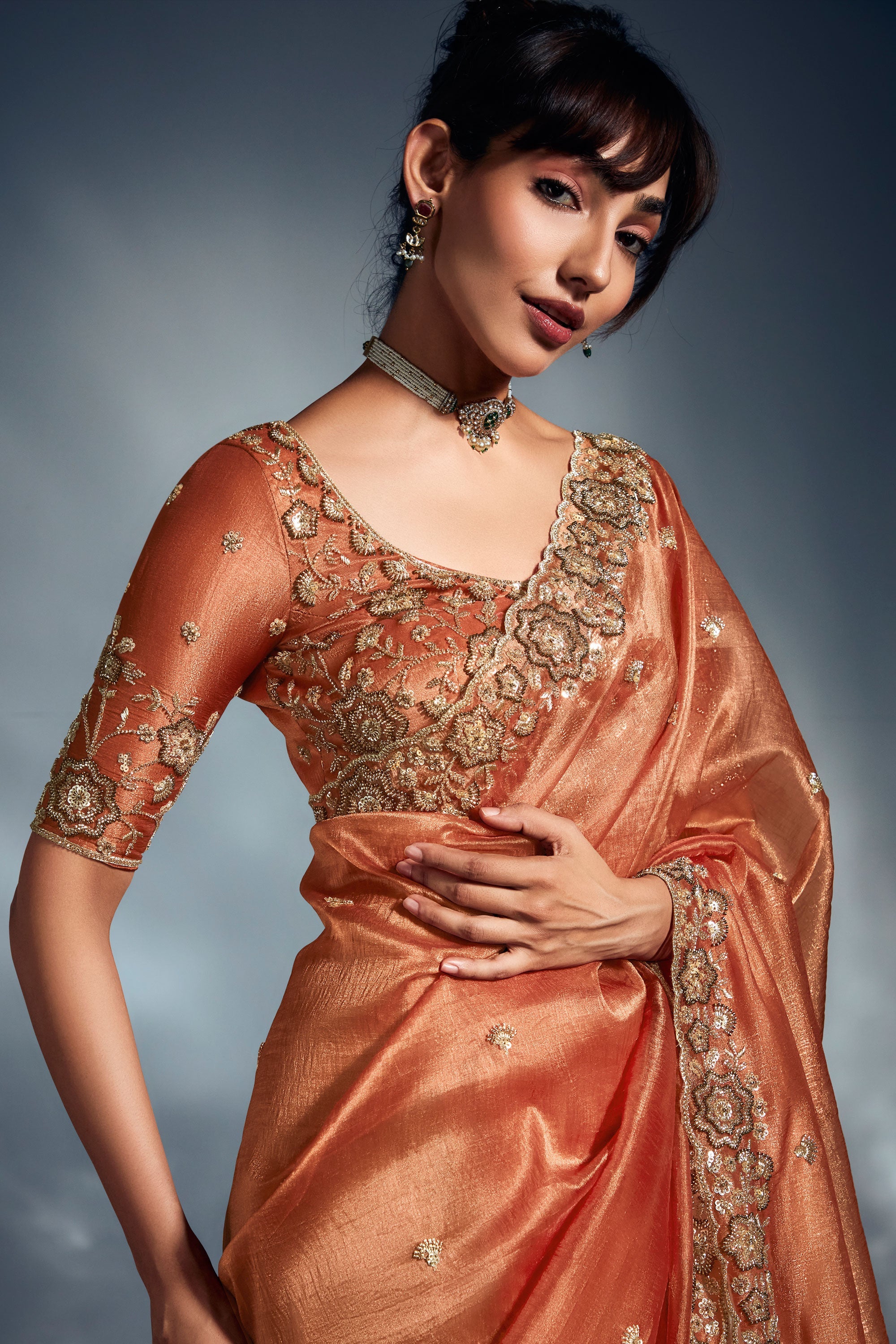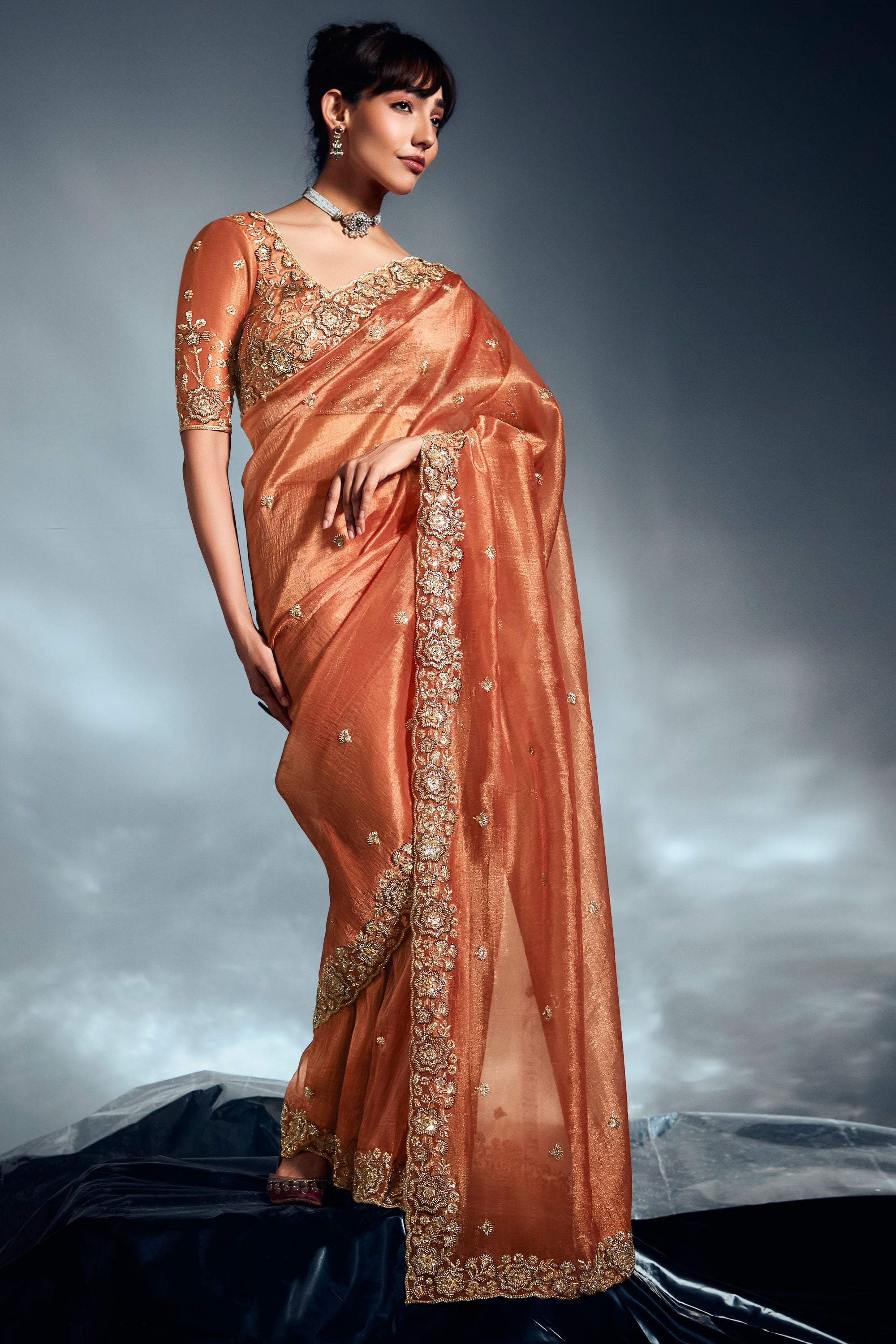 Orange Color Organza Fabric Coveted Saree With Fancy Heavy Work