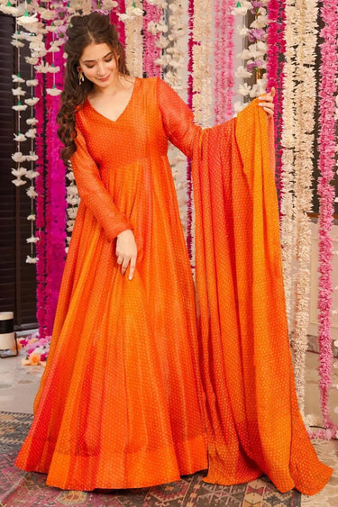 Orange Digital Printed Floor Touch Readymade Anarkali Style Gown With Dupatta