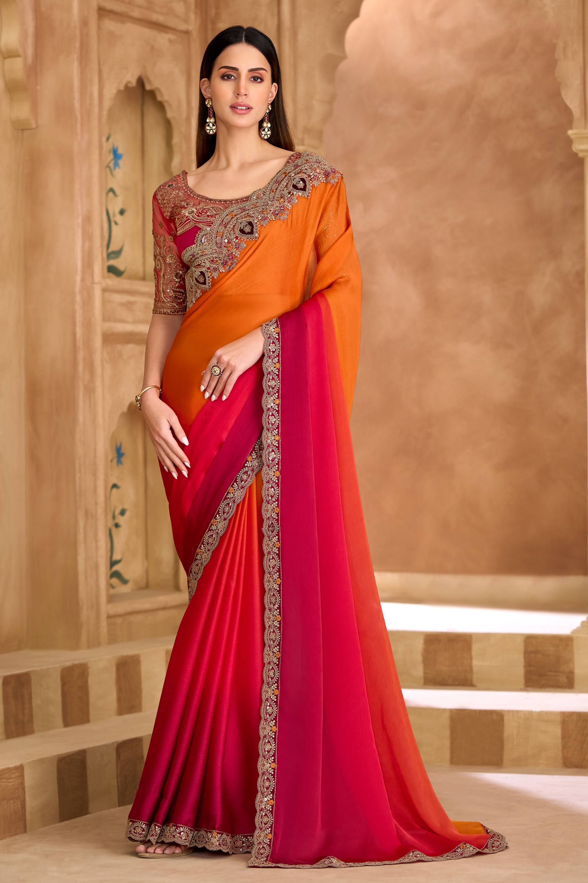 Orange Festive Wear Satin Chiffon Lace Border Work Designer Saree