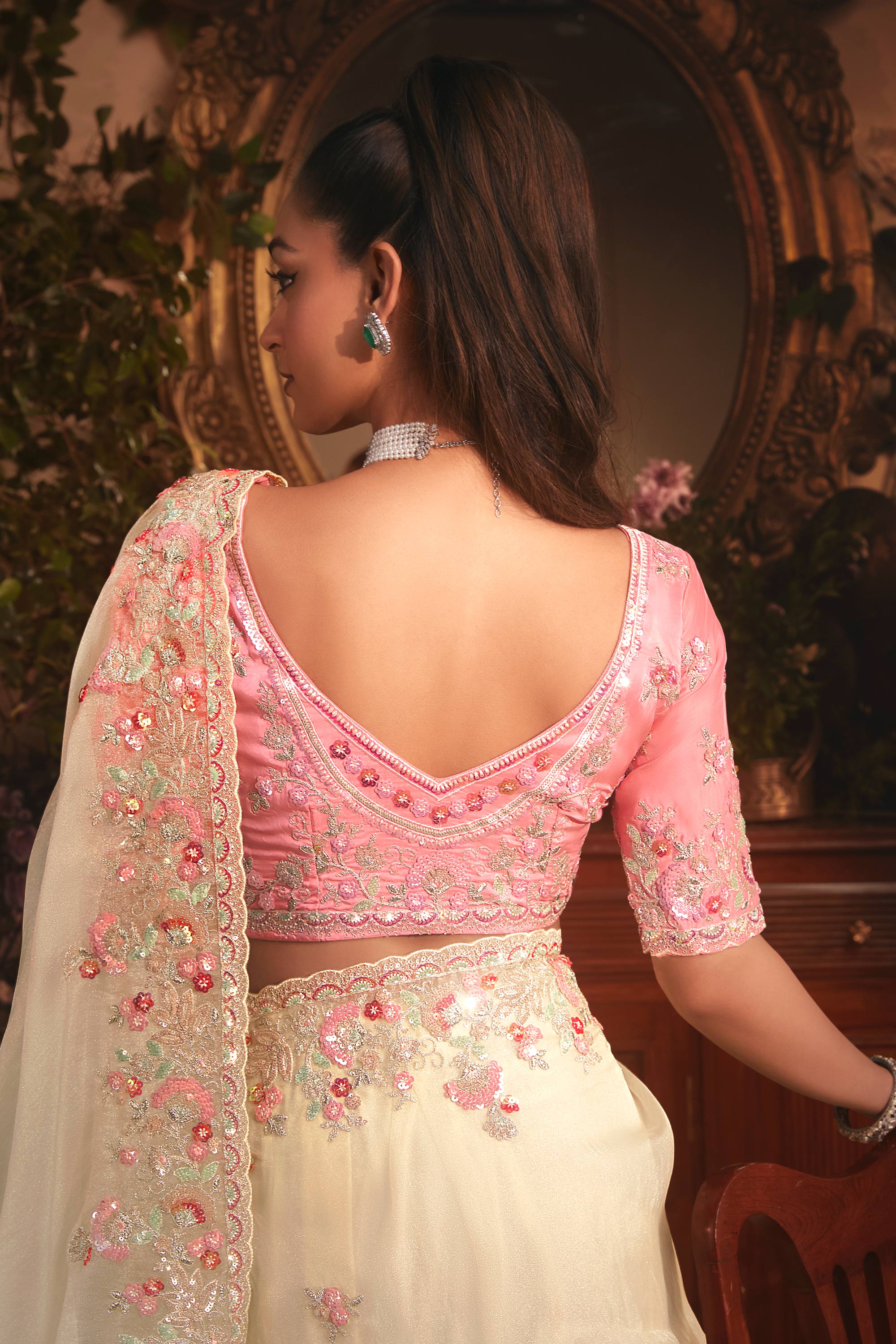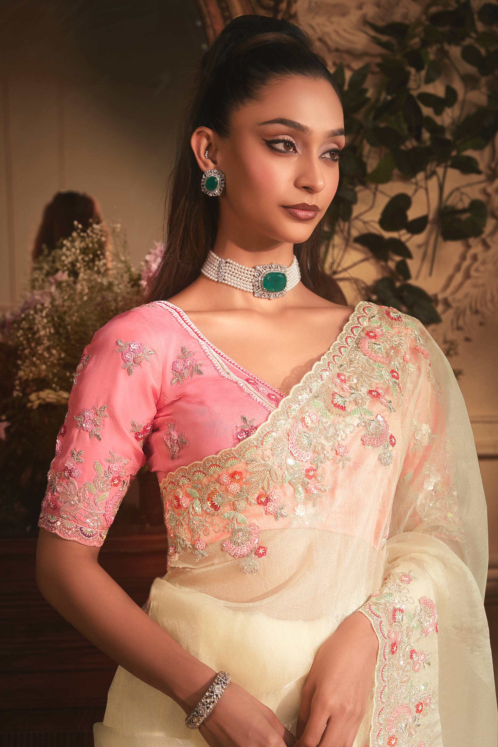 Add a touch of ethereal charm to your festive wardrobe with this elegant Designer Tissue Organza Saree. The sheer, lightweight tissue organza fabric lends a graceful flow and a soft shimmer, perfect for festive and function wear. Paired with a rich silk blouse, it creates a luxurious contrast that elevates the entire look. Intricately crafted border work enhances the saree’s refined appeal, making it an ideal choice for weddings, festivals, and special celebrations. Effortlessly stylish and delicately detailed, this saree is a timeless statement of sophistication. Note: Due to digital photography, slight color variations may occur