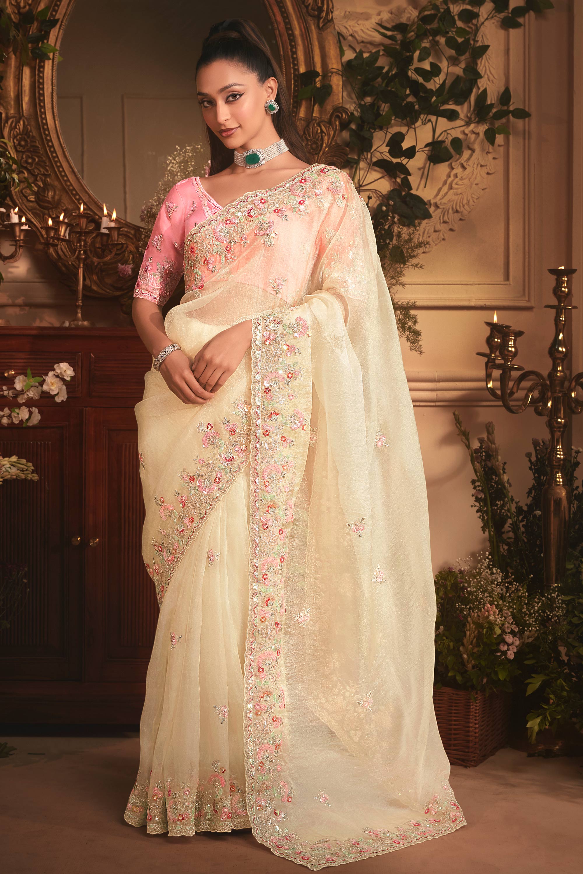 Organza Fabric Beige Color Patterned Saree With Border Work