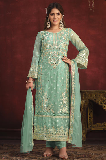 Organza Fabric Party Wear Sea Green Color Embroidered Designer Long Suit