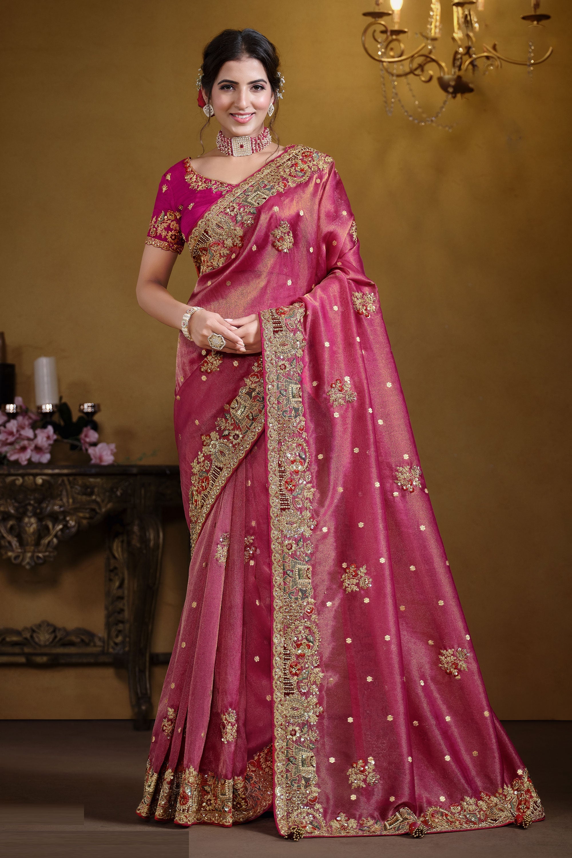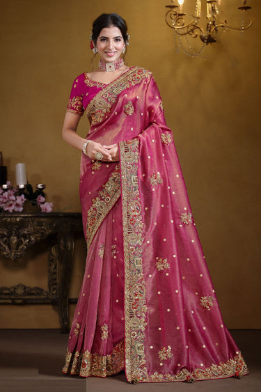 Organza Silk Mesmeric Sequins Work Saree In Rani Color