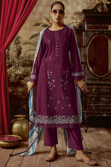 Parsi Embroidered Art Silk Long Straight Cut Salwar Kameez In Wine Color