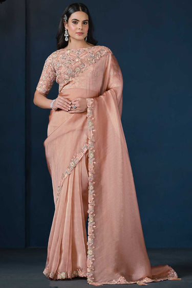 Peach Glace Tissue Sequins Moti Work Saree With Unstitched Blouse
