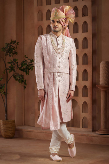Pink Art Silk Fabric Wedding Wear Trendy Readymade Groom Sherwani For Men