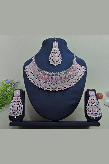 Pink Color Chic Alloy Necklace With Earrings and Mang Tikka