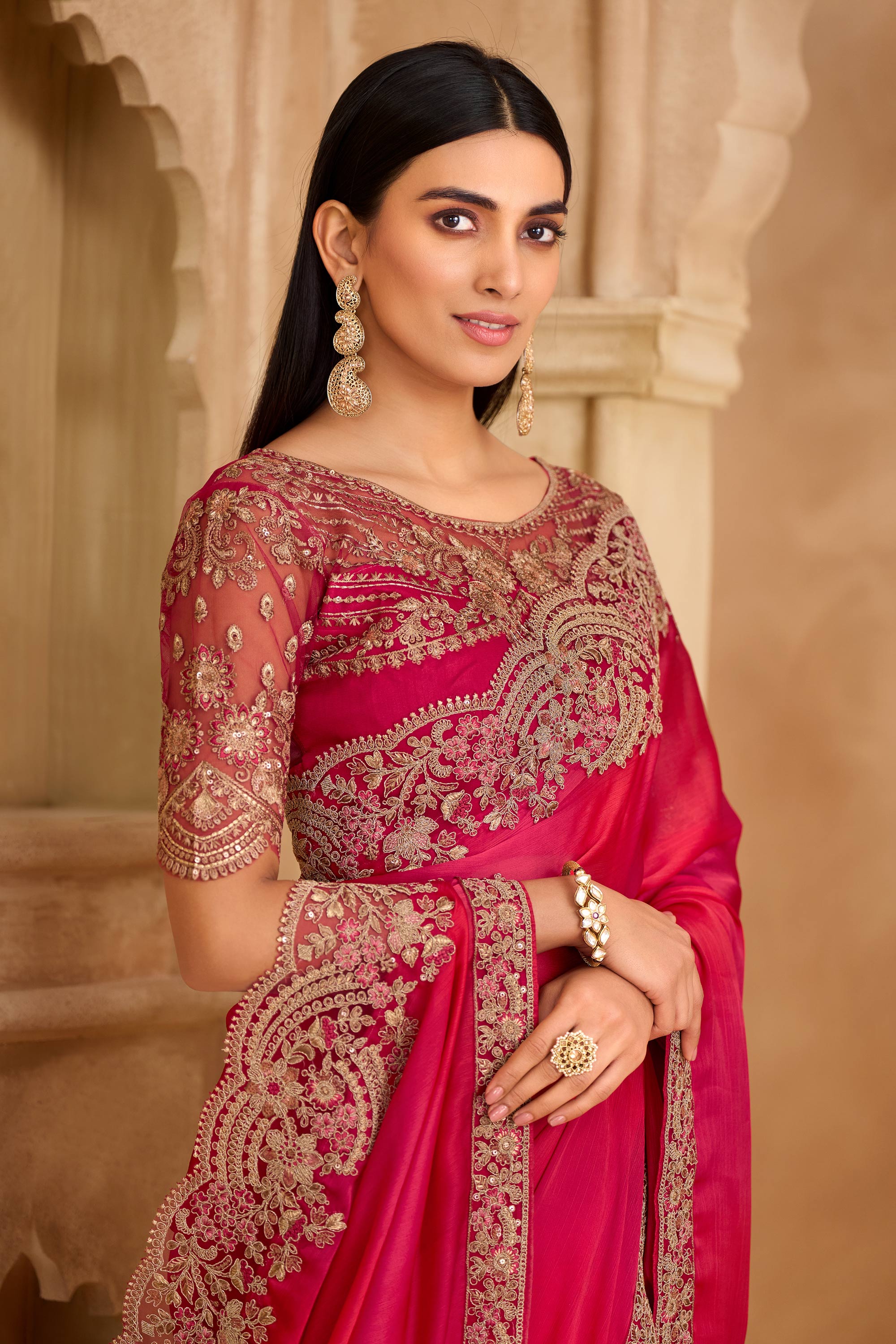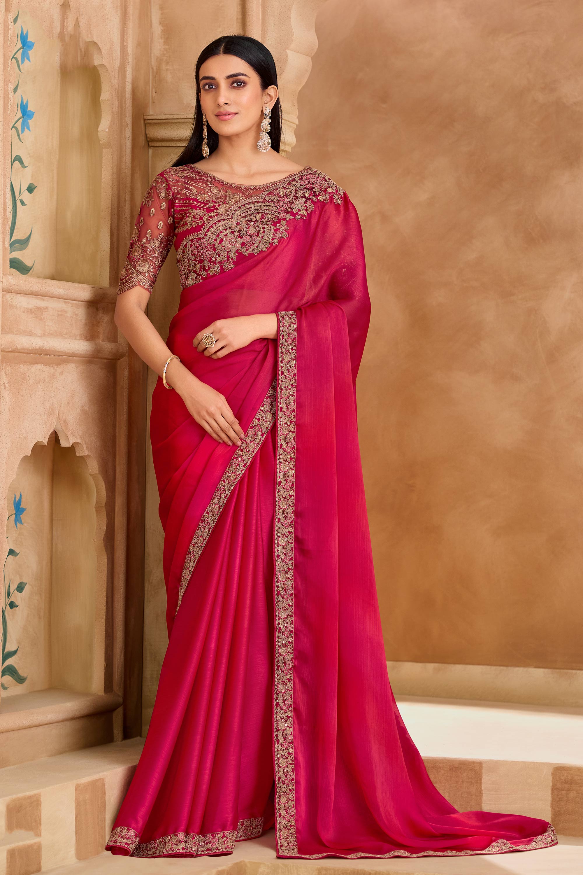 Pink Festive Wear Satin Chiffon Lace Border Work Designer Saree