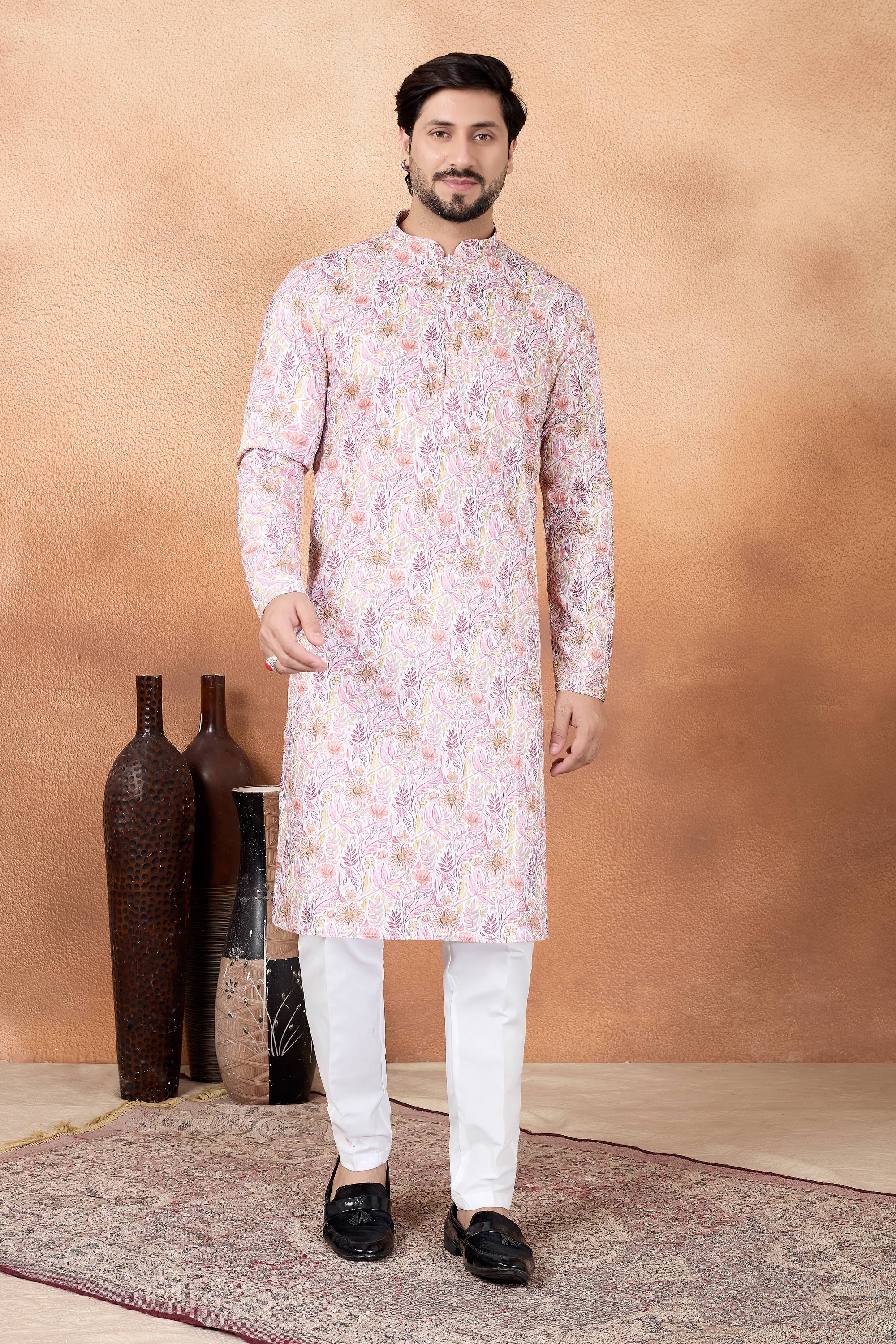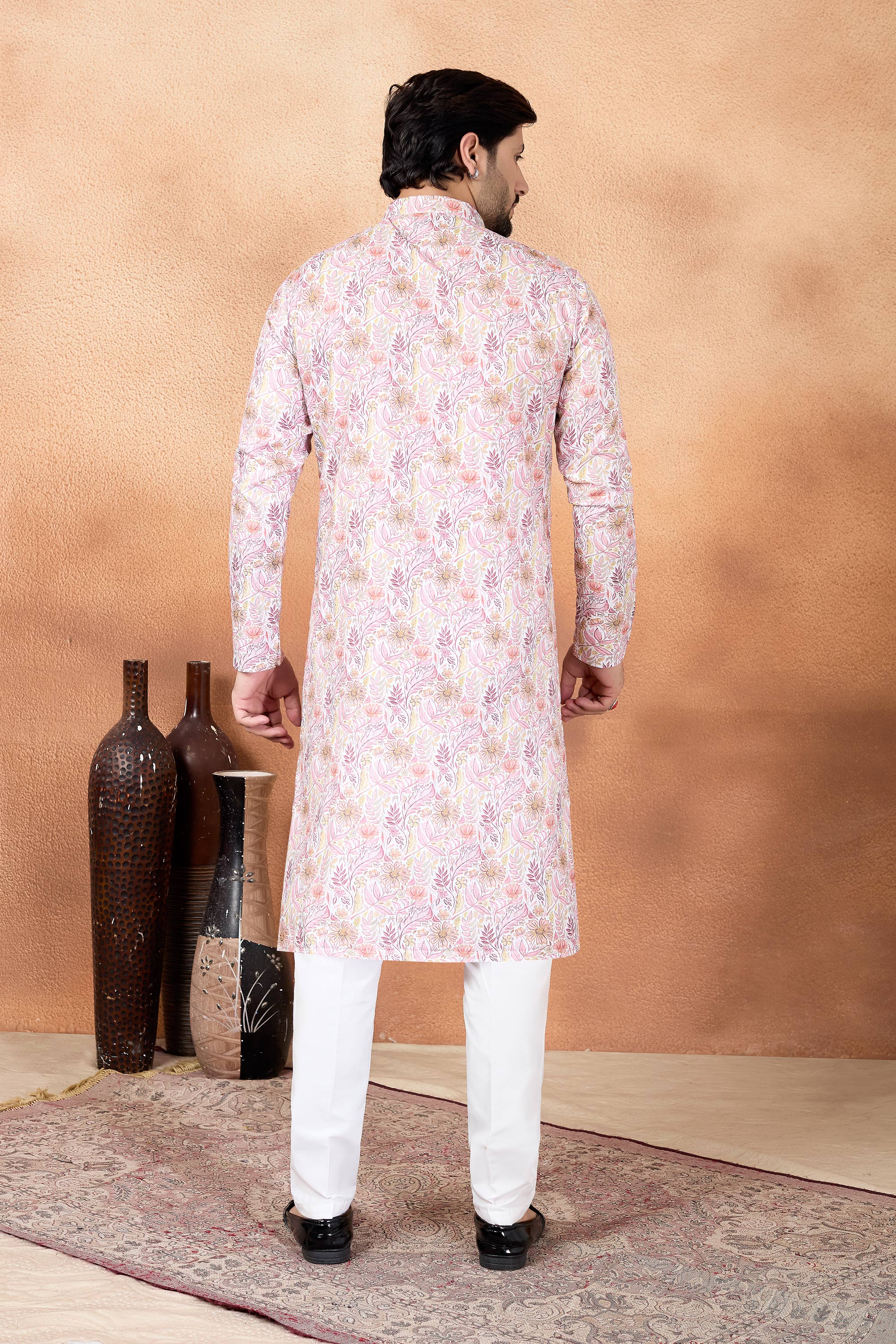 Pink Function Wear Art Silk Fabric Readymade Kurta Pyjama For Men