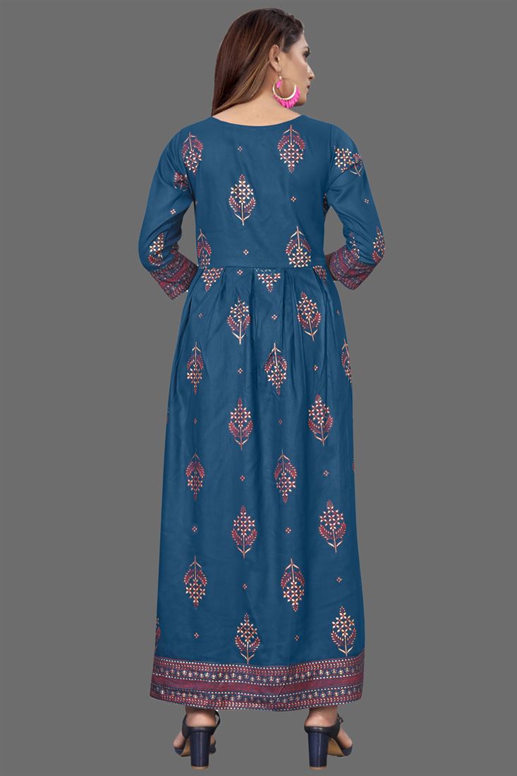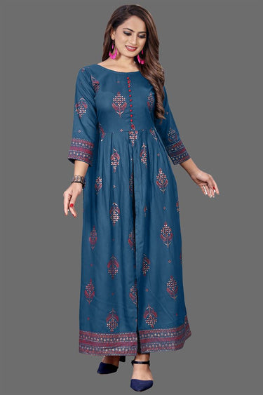 Pleasant Rayon Fabric Teal Color Excellent Foil Printed Work Readymade Kurti