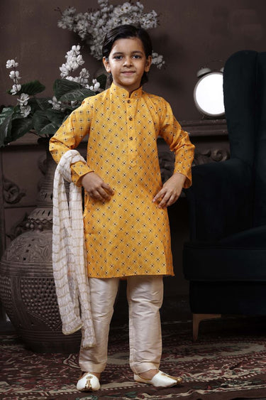 Pretty Yellow Color Cotton Fabric Printed Wedding Wear Readymade Boys Kurta Pyjama