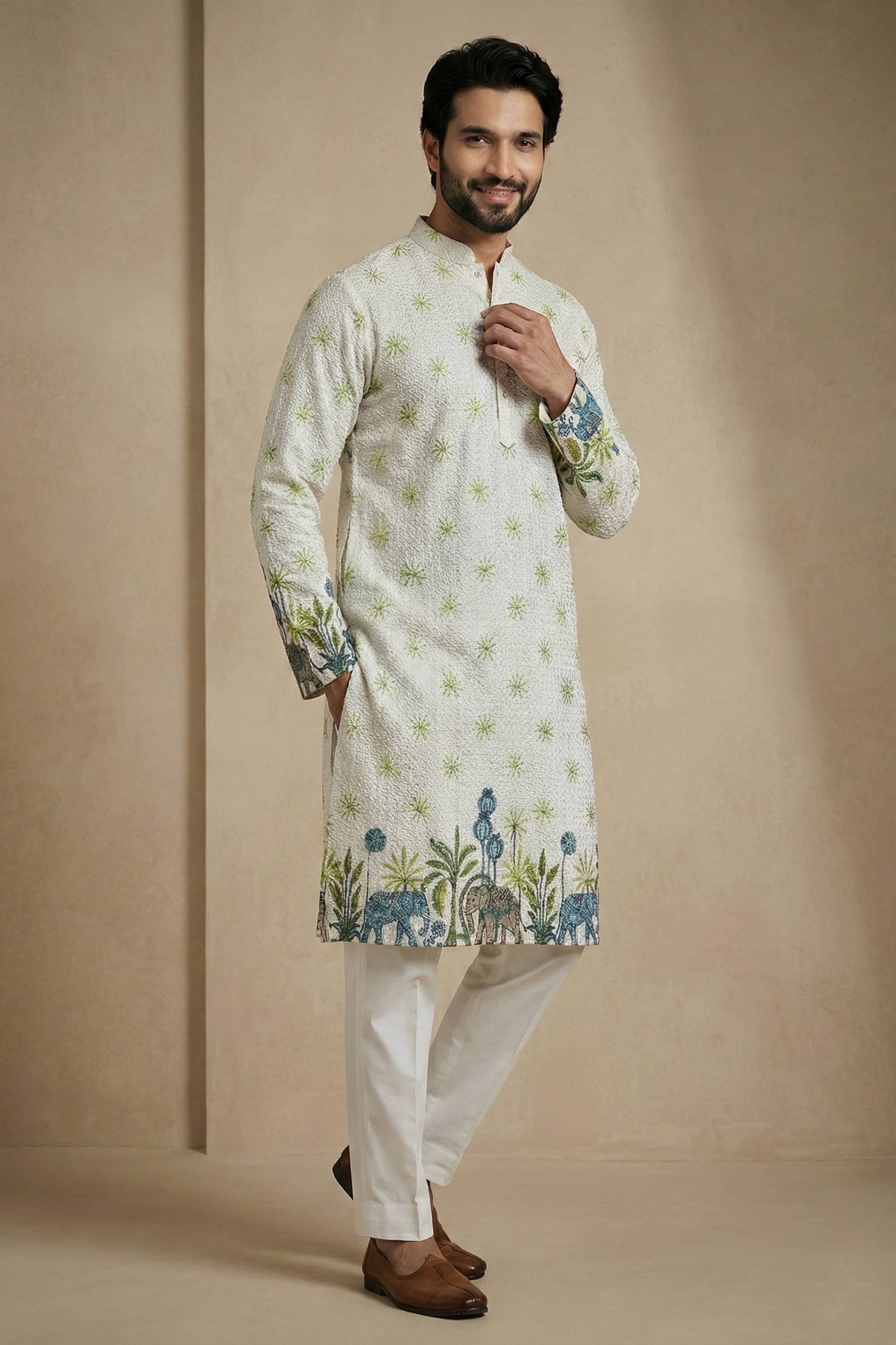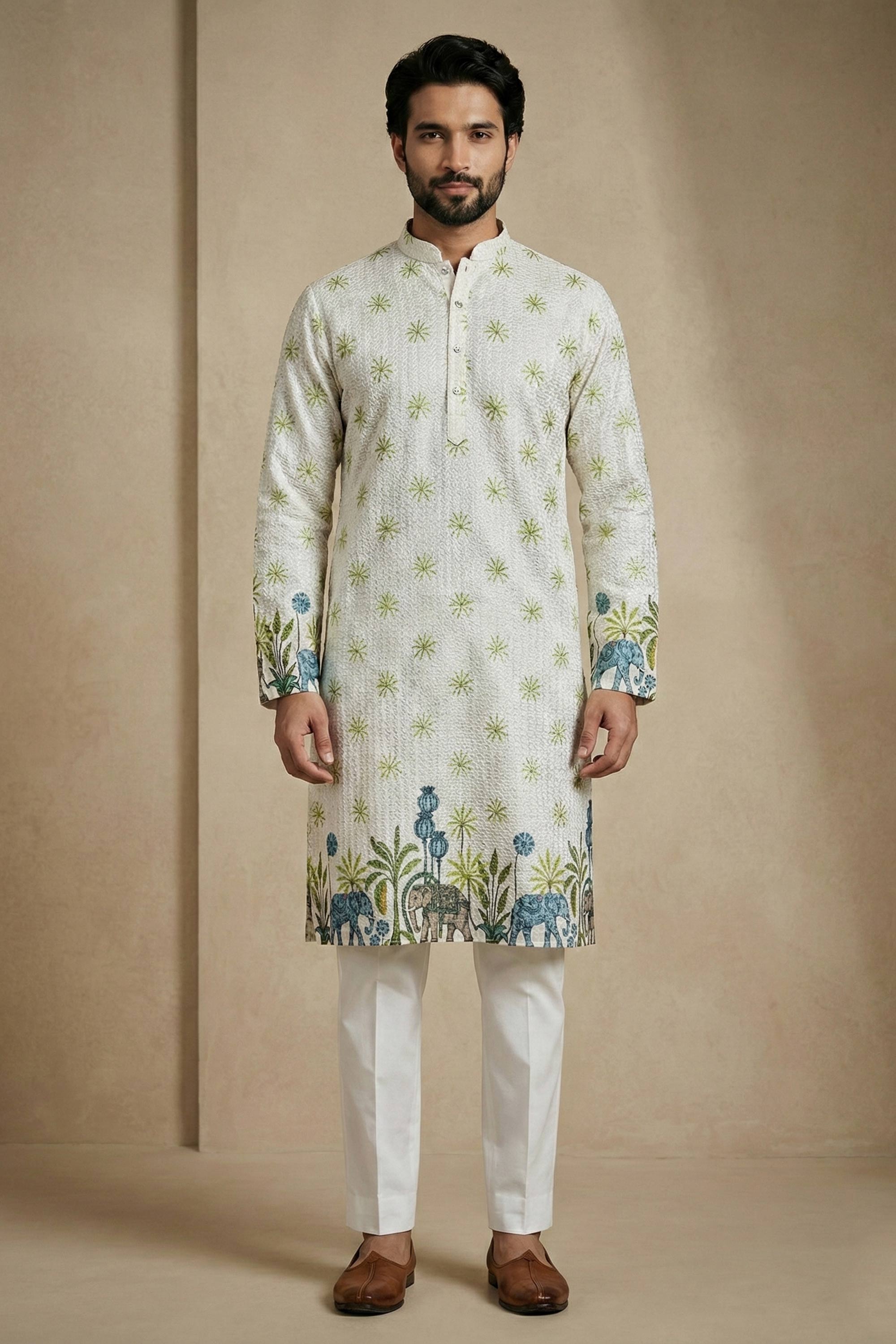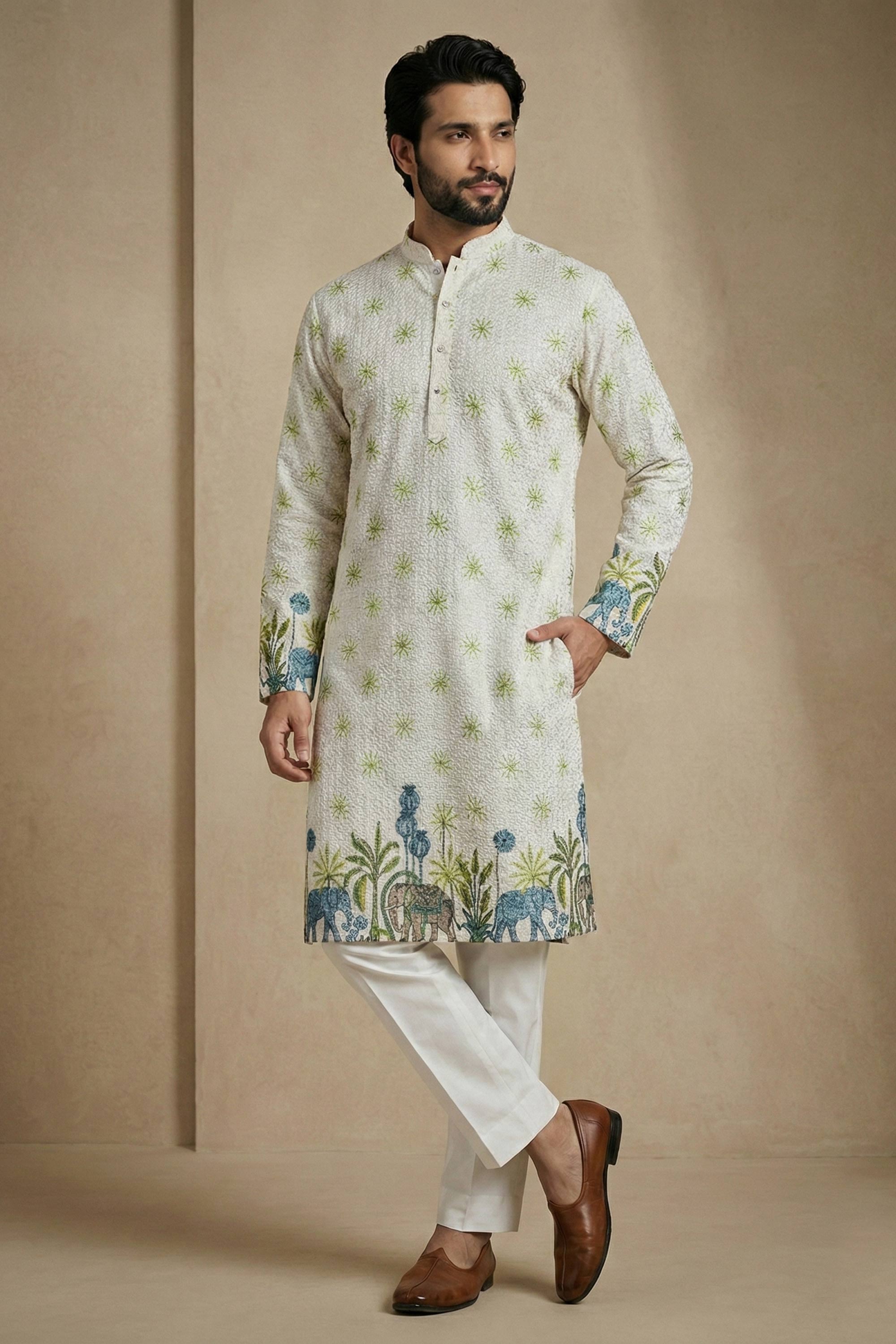 Printed Multi Color Cotton Fabric Wedding Wear Readymade Kurta Pyjama For Men