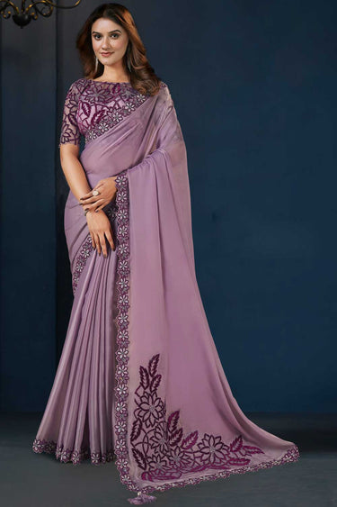 Purple Crepe Satin Silk Embroidered Stone Work Saree With Unstitched Blouse