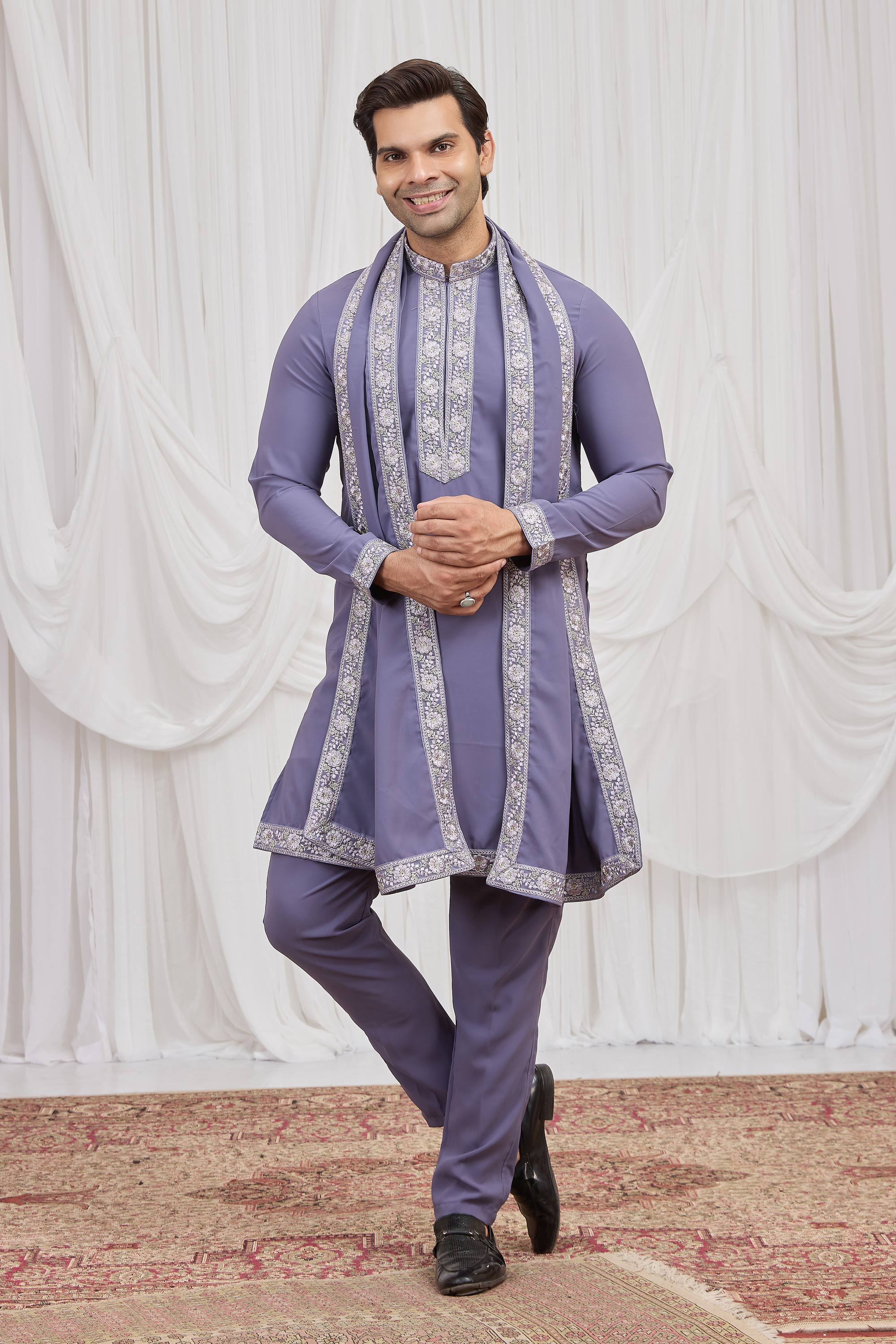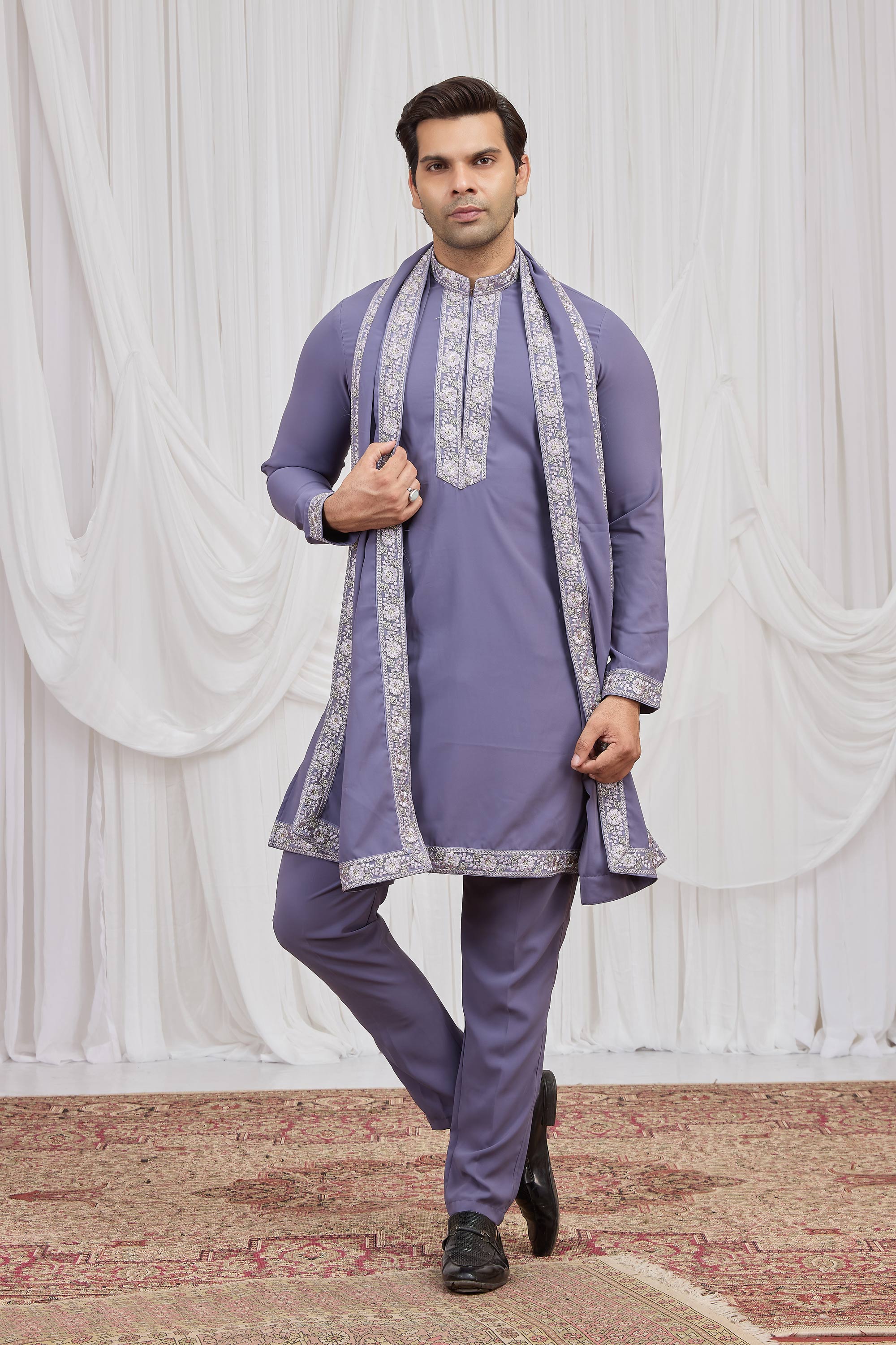 Purple Function Wear Fancy Fabric Readymade Kurta Pyjama With Dupatta For Men