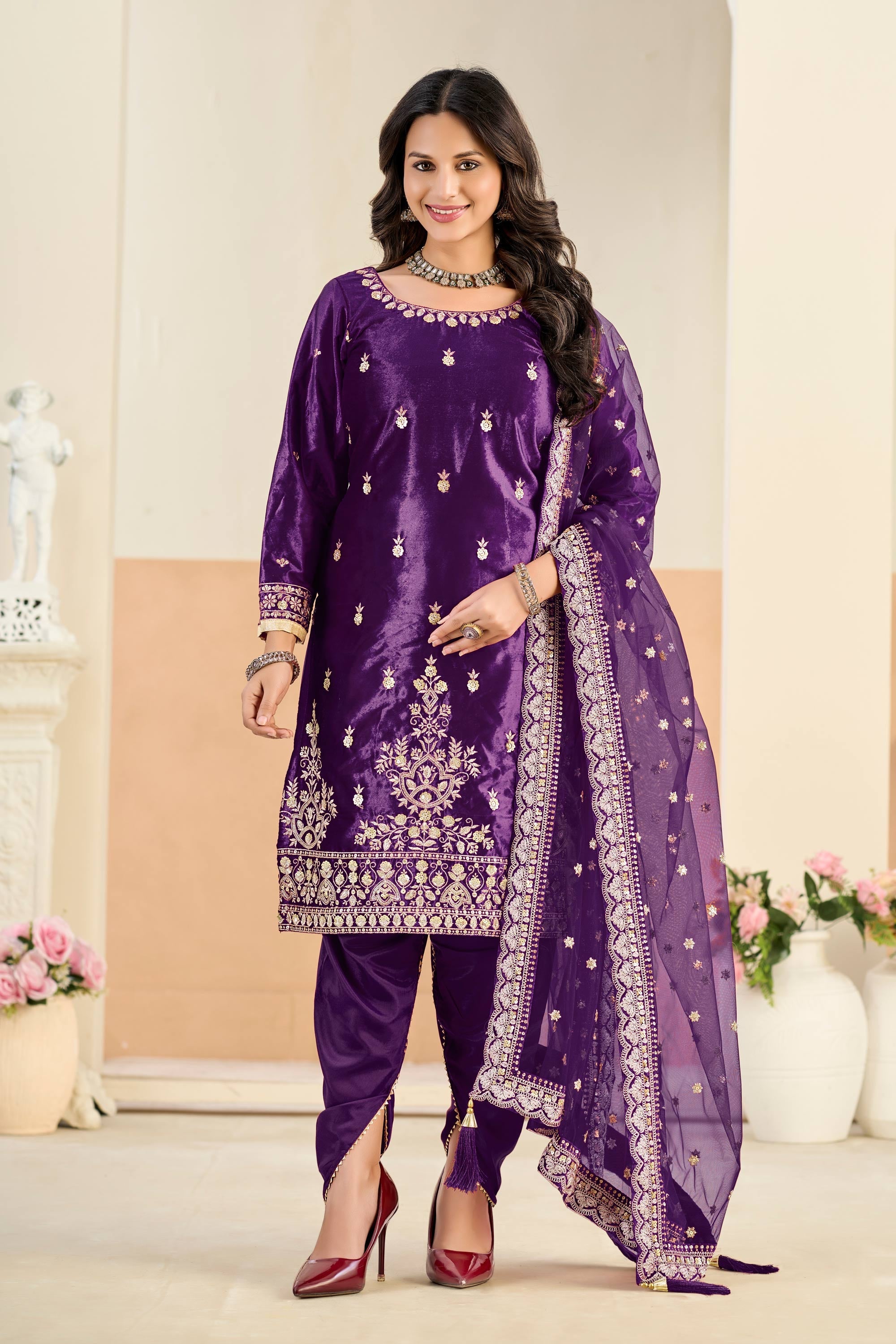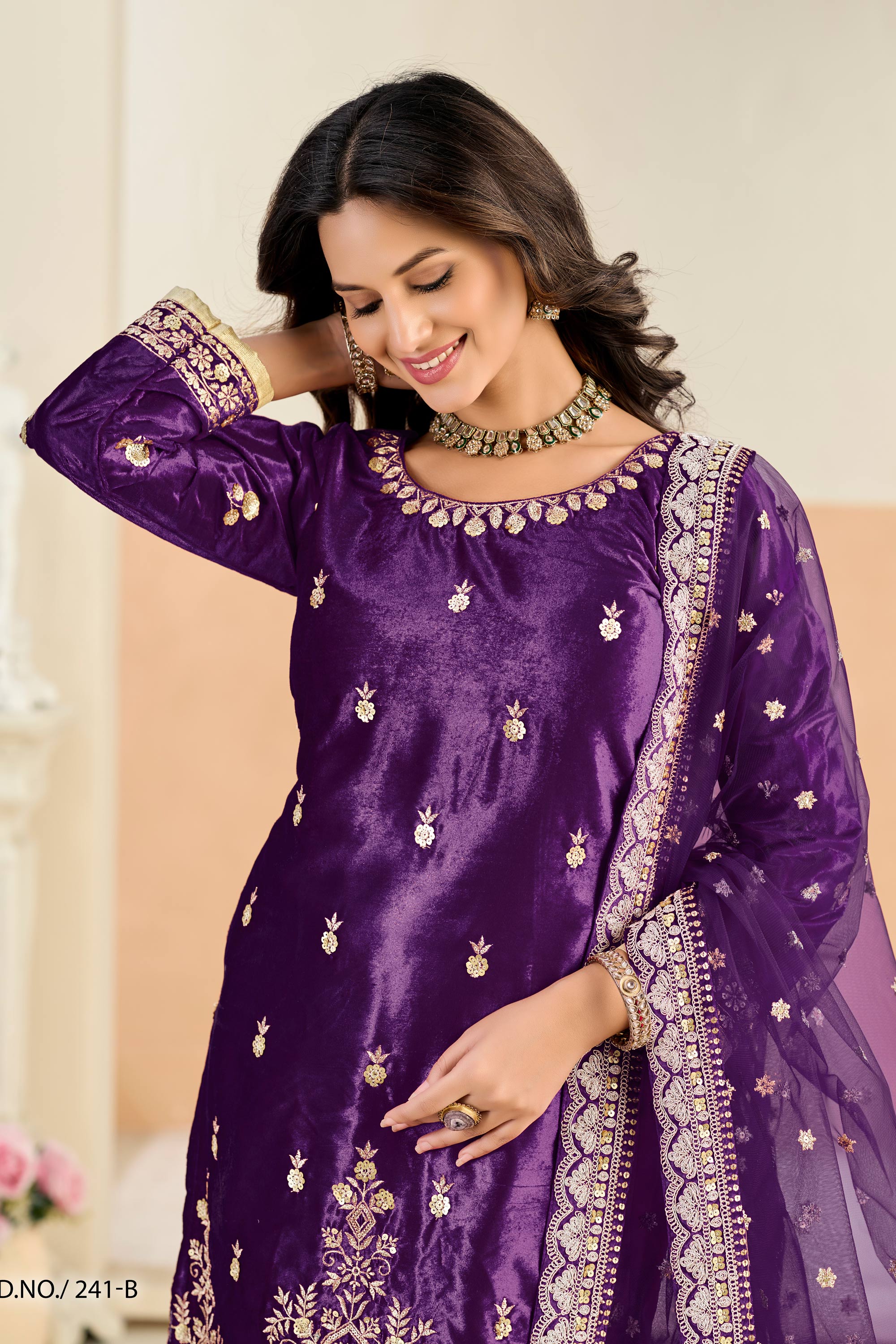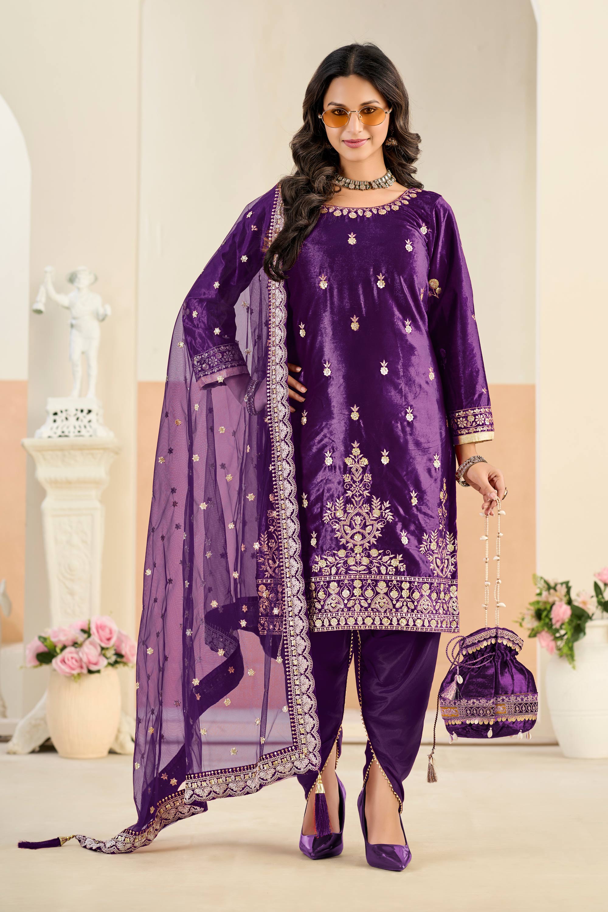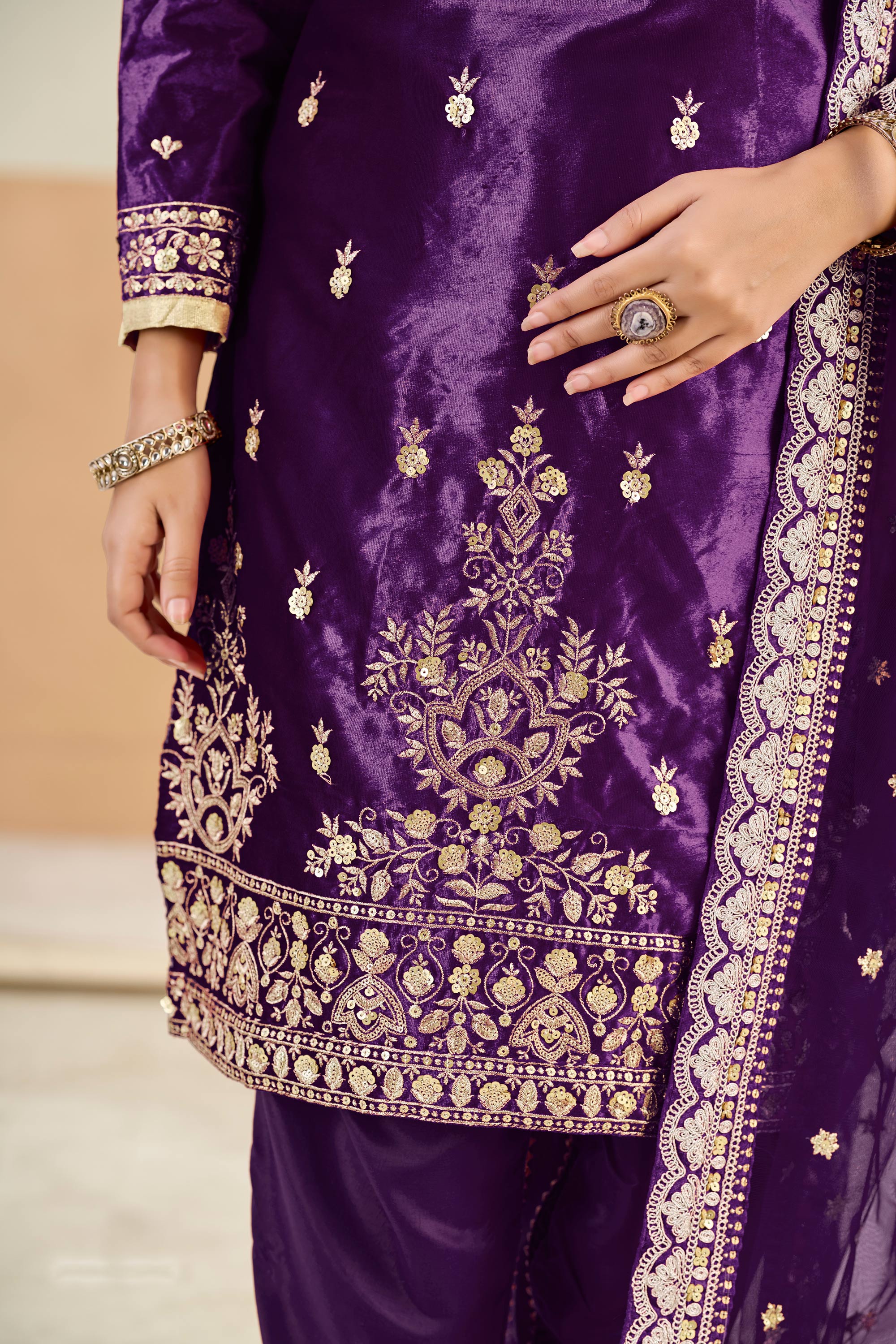 Purple Function Wear Velvet Embroidered Designer Straight Cut Salwar Kameez