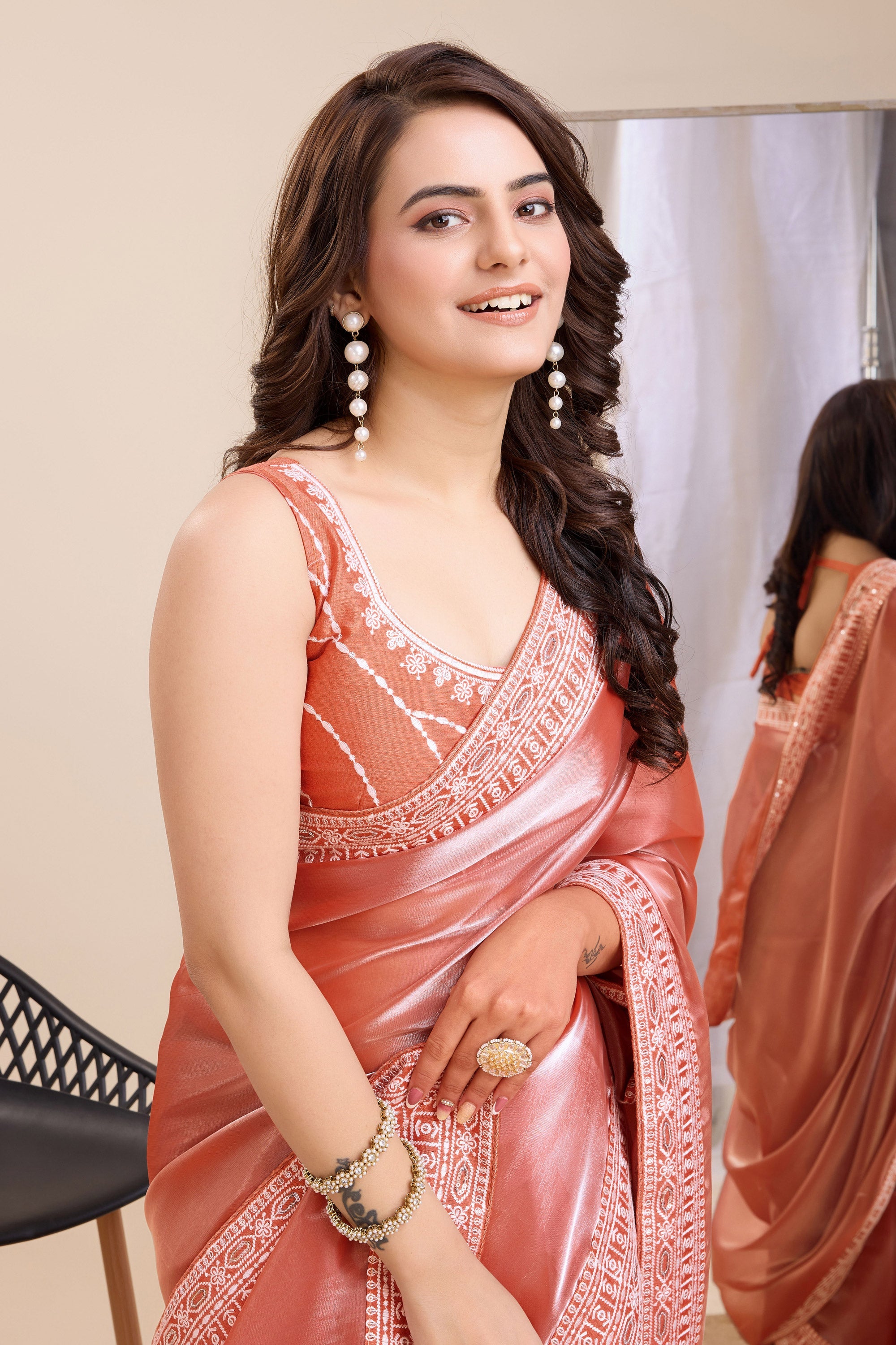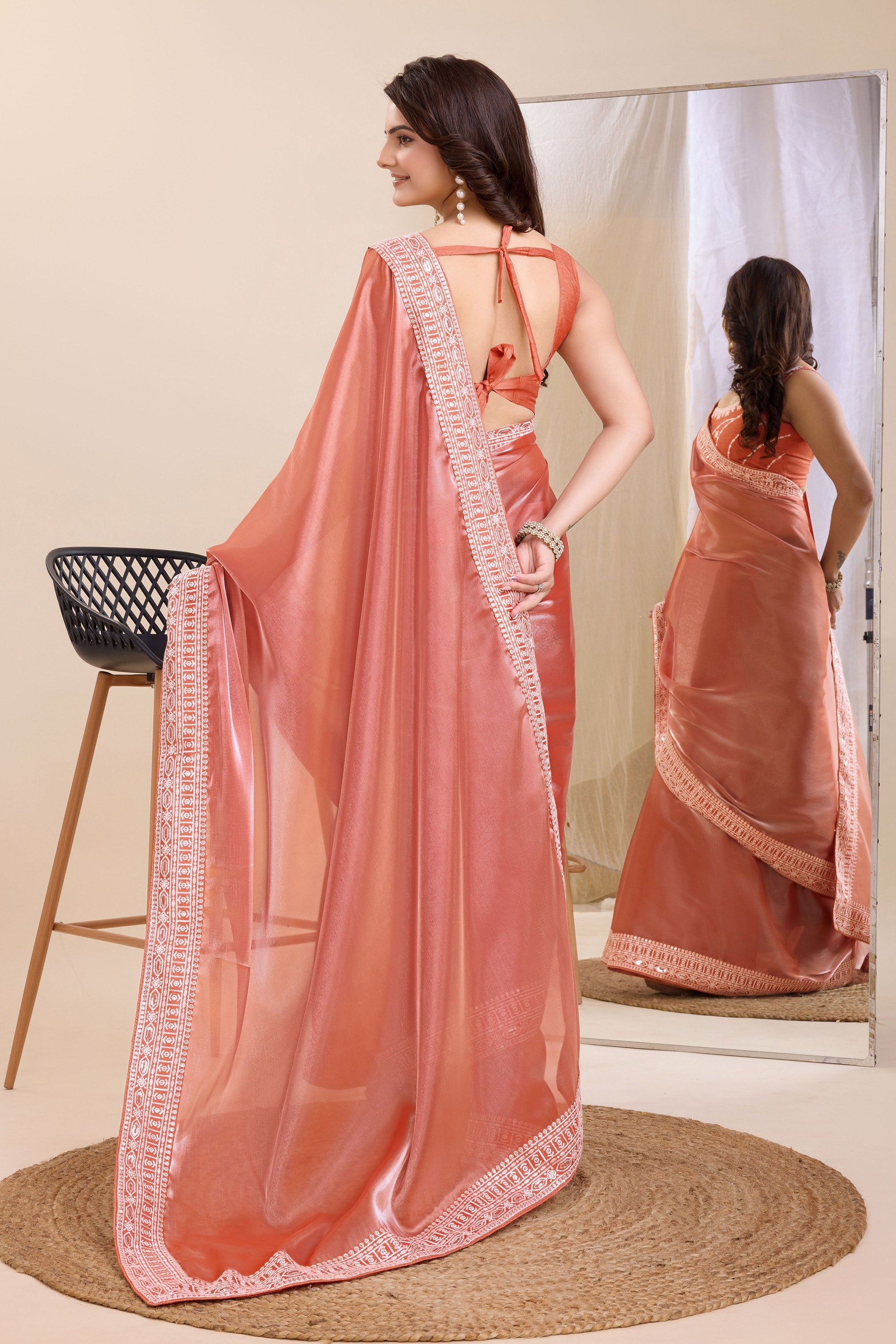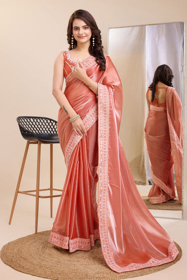 Radiant Peach Color Festival Wear Border Work Art Silk Saree