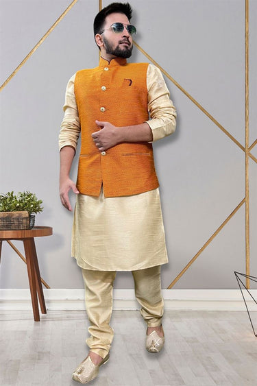 Readymade Art Silk Fabric Beautiful Kurta Pyjama For Men With Orange Color 3 Pcs Jacket Set