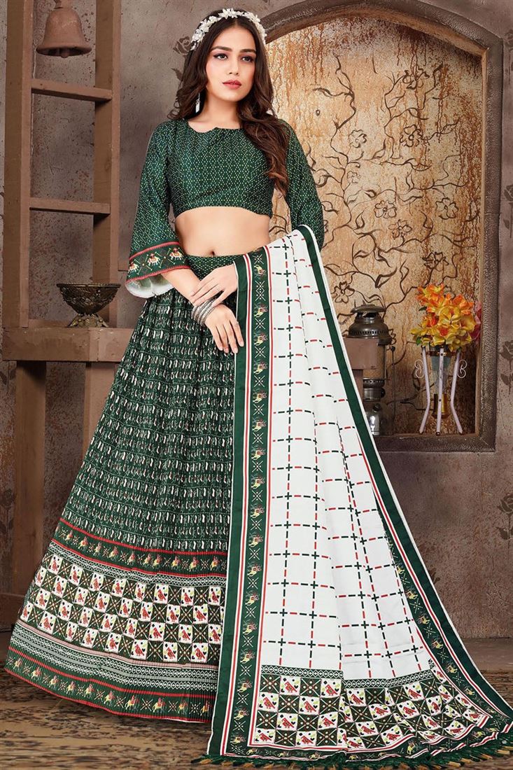 Readymade Satin Silk Fabric Dark Green Color Adorming Printed Lehenga