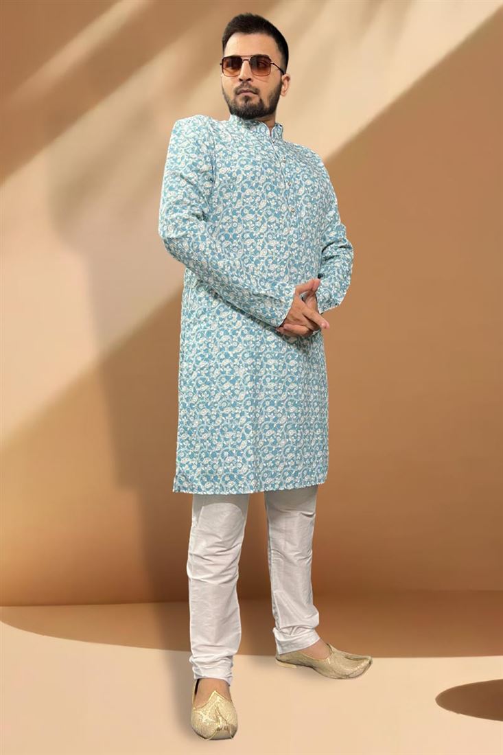 Reception Wear Attractive Kurta Pyjama For Men In Blue Color Cotton Fabric
