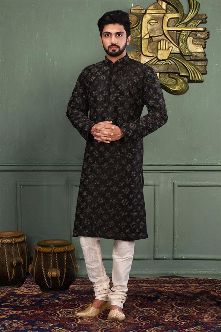 Reception Wear Attractive Readymade Men Kurta Pyjama In Black Color