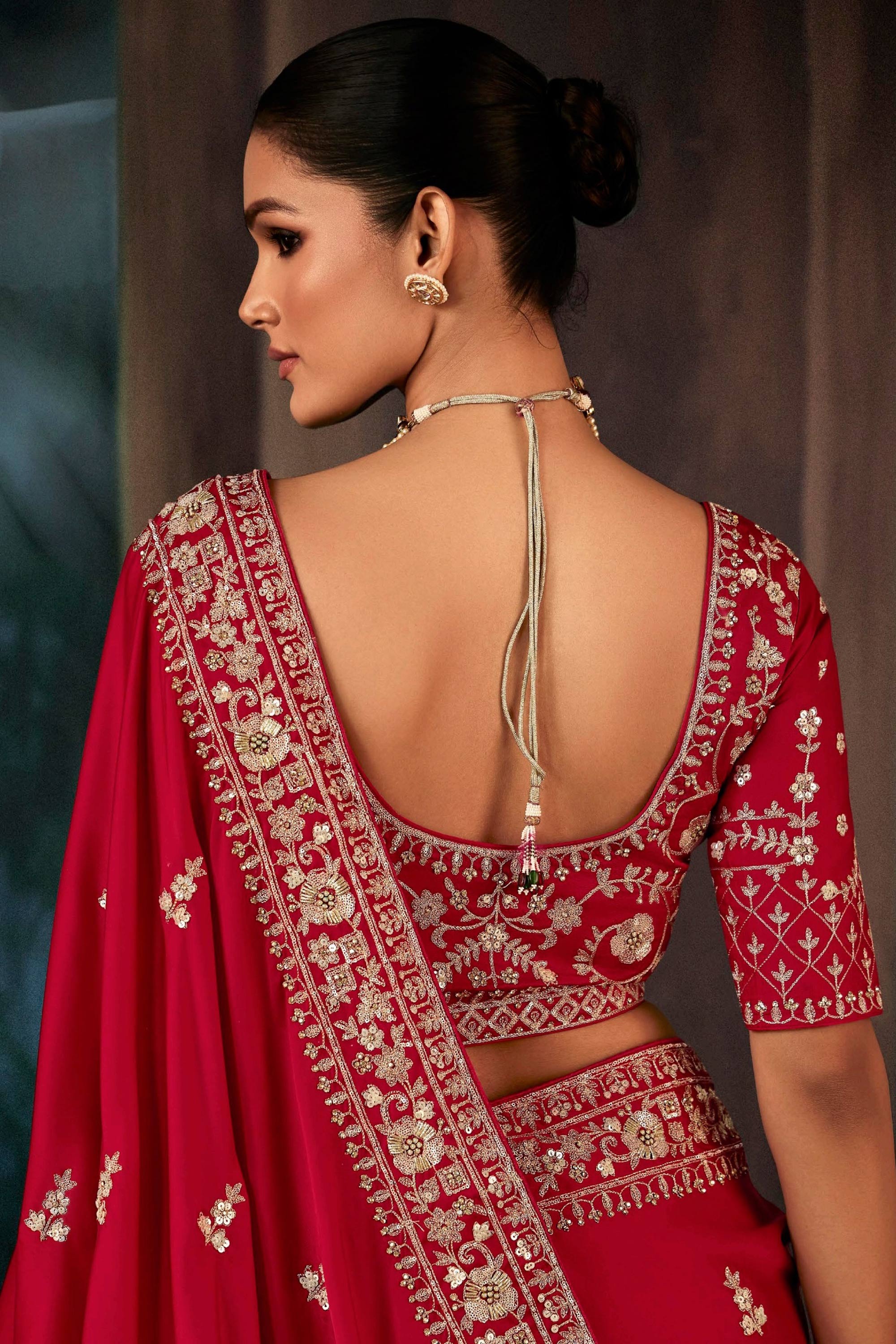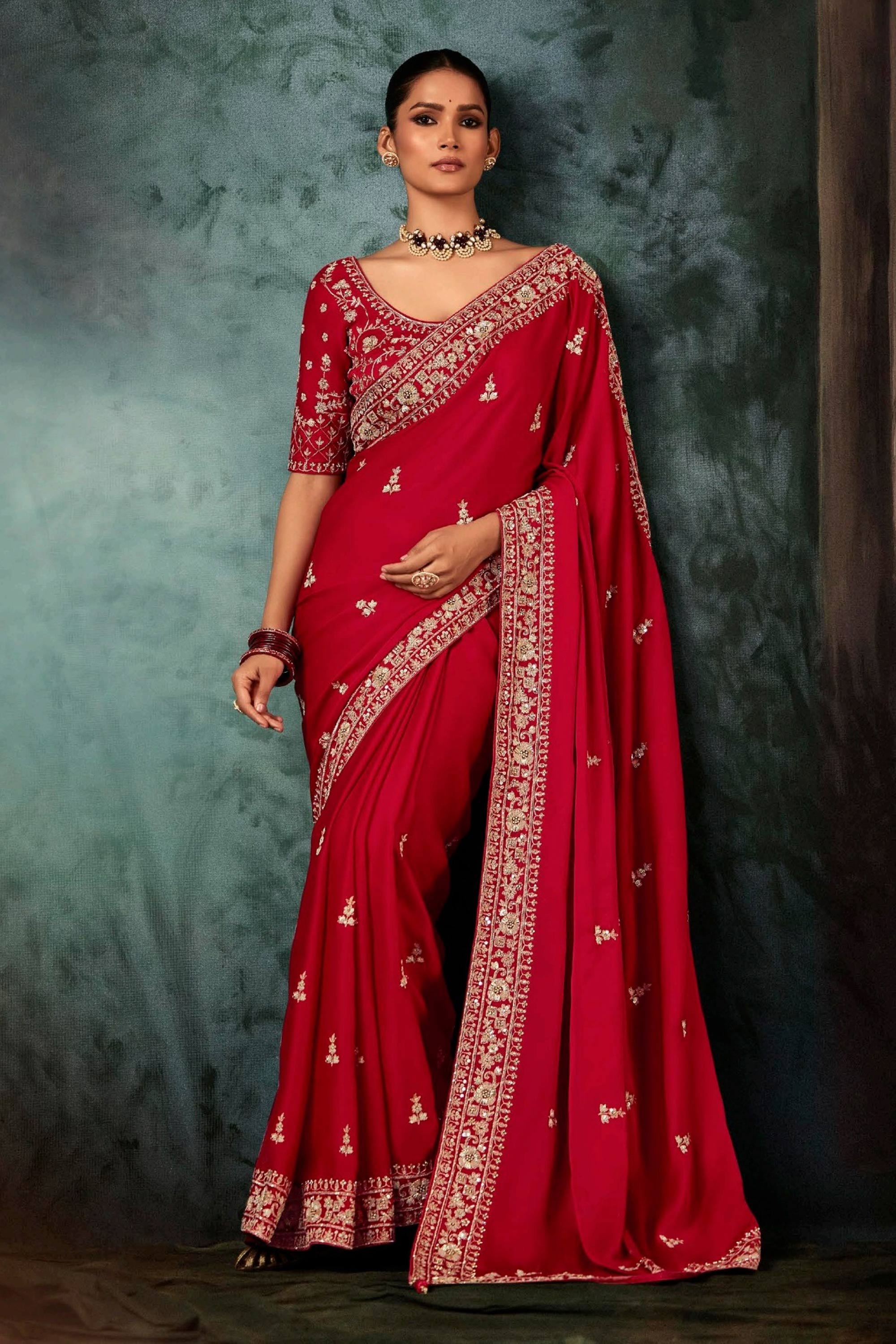 Red Wedding Wear Fancy Fabric Embroidered Saree