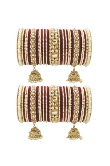 Riveting Alloy Material Jhumki Bridal Set With Pearl Kadas In Maroon Color
