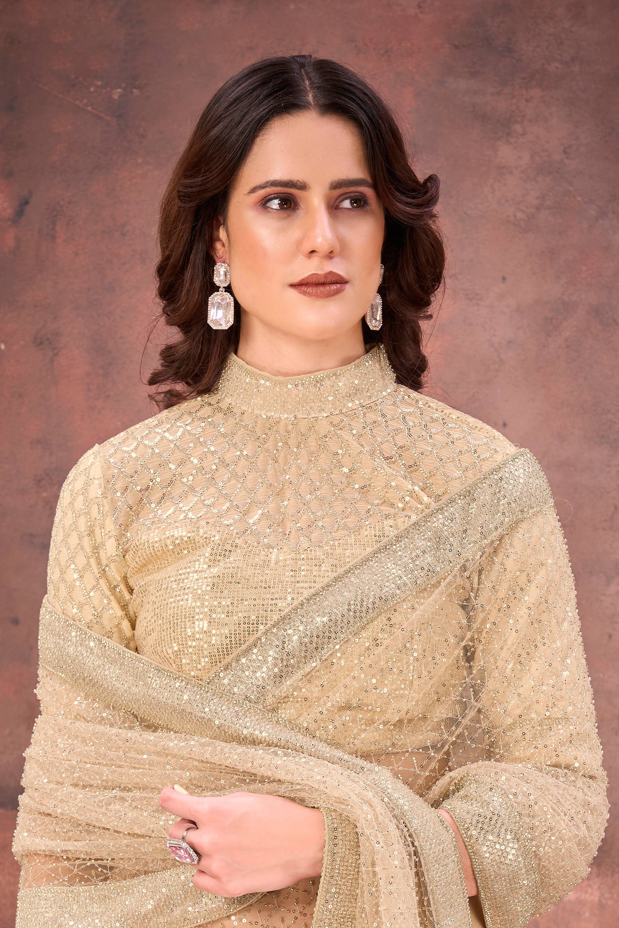 Satin And Net Fabric Cream Readymade Saree For Party Wear