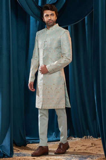 Satin Fabric Heavy Embroidered Light Blue Color Wedding Wear Designer Readymade Indo Western For Men