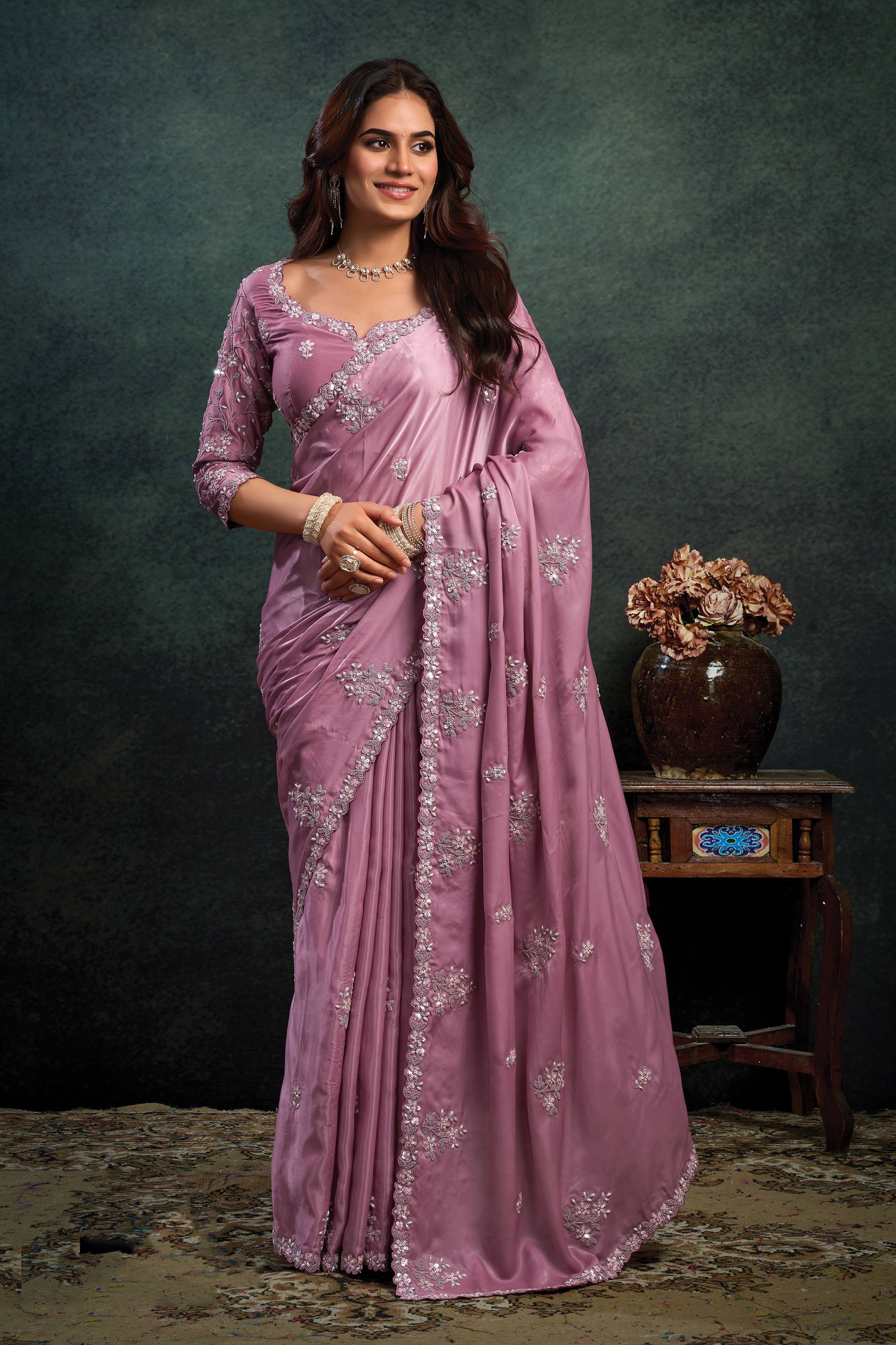 Satin Fabric Pink Embroidered Border Work Saree For Wedding Wear