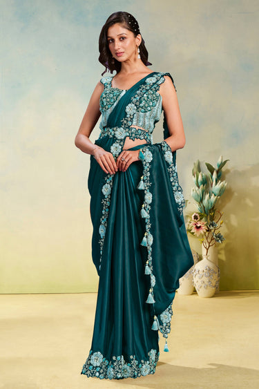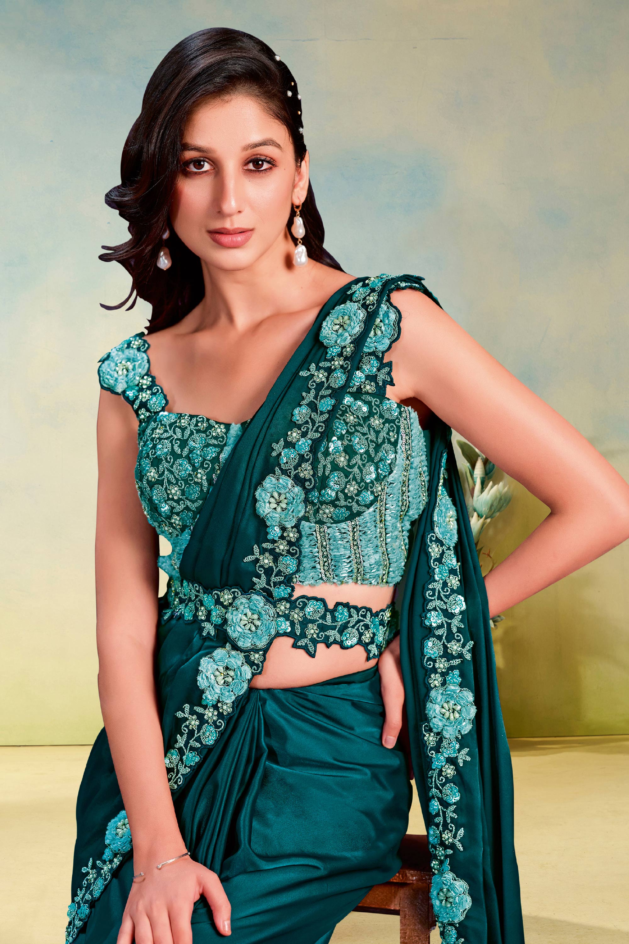 Satin Silk Border Work Teal Readymade Saree For Wedding Wear