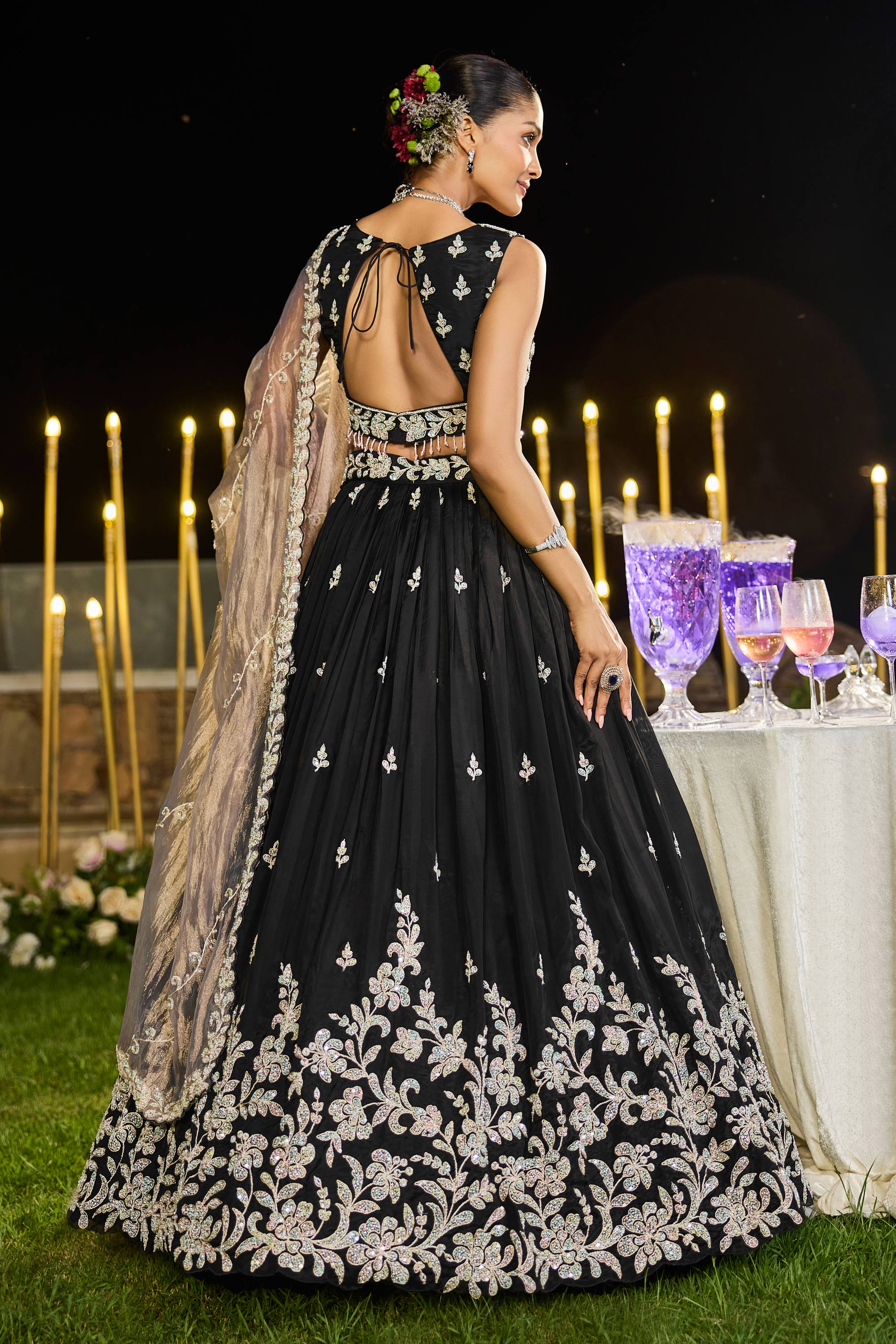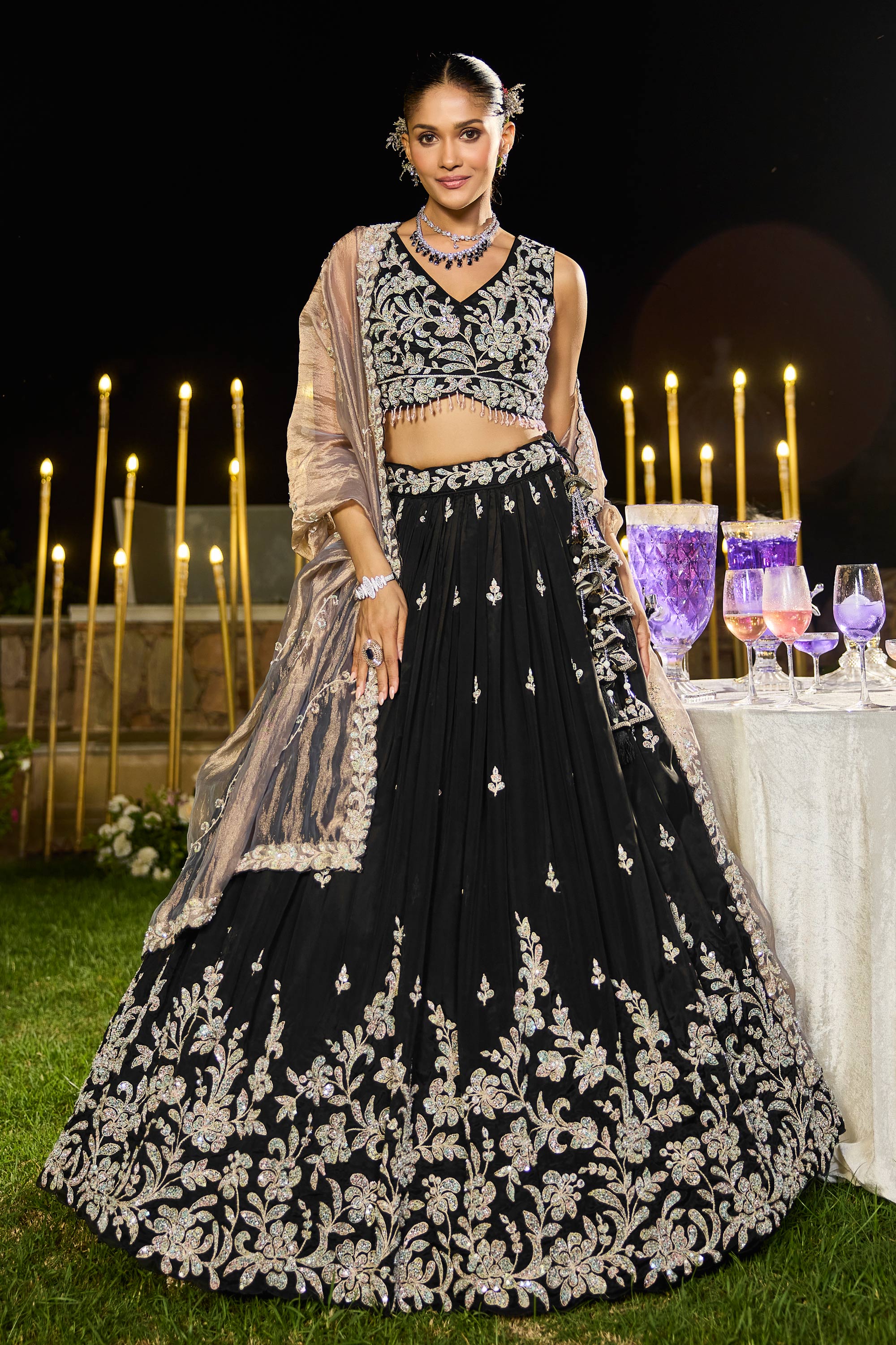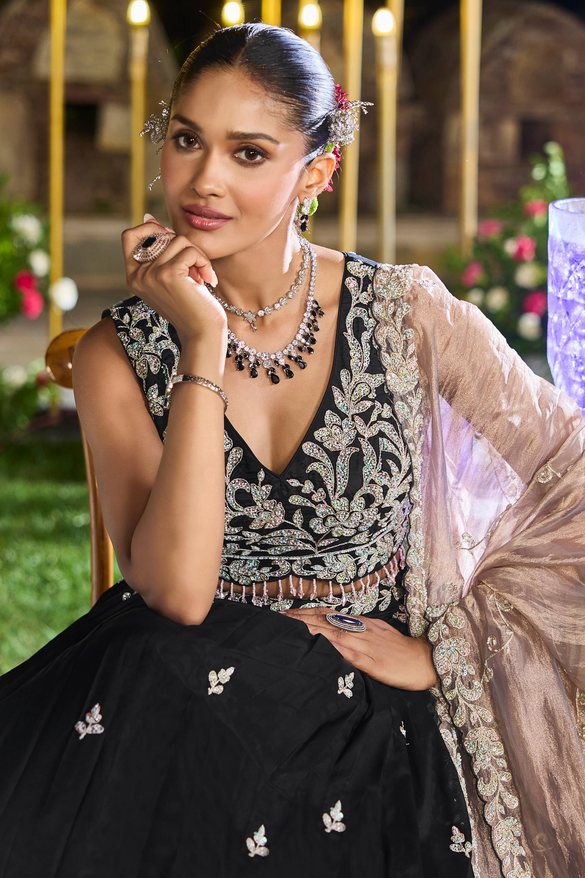 Satin Silk Embroidered Black Lehenga Choli For Wedding Wear