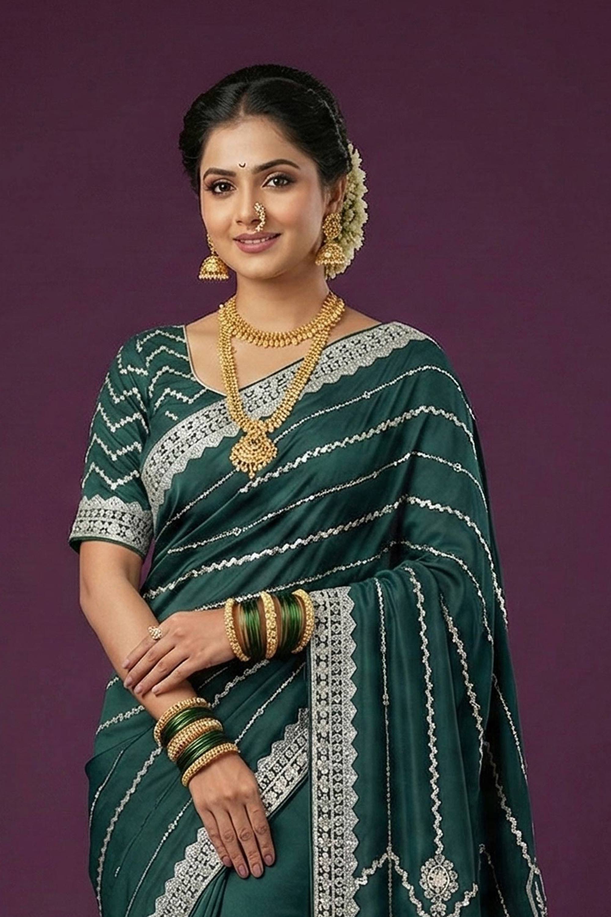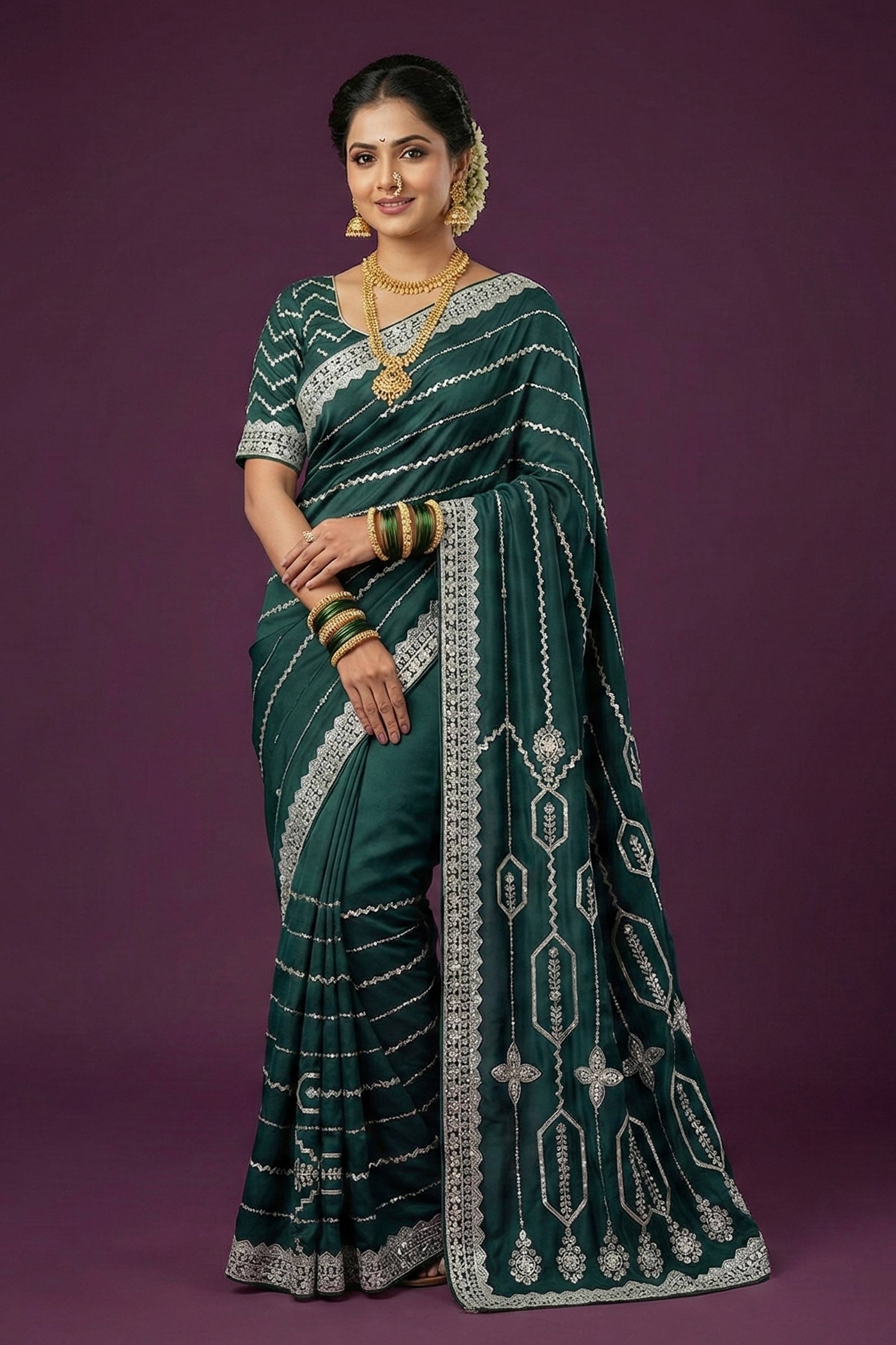 Satin Silk Embroidered Teal Sangeet Wear Saree
