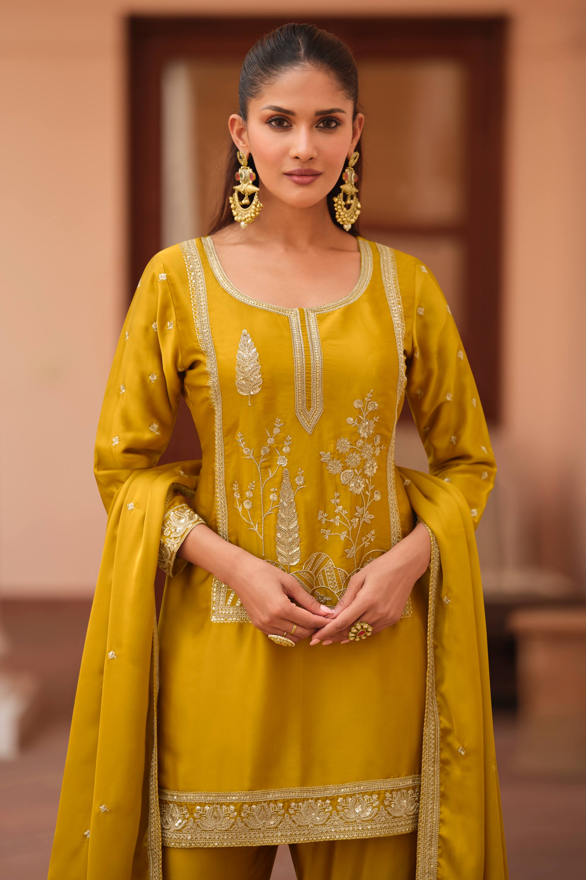 Satin Silk Mustard Embroidered Readymade Palazzo Salwar Suit