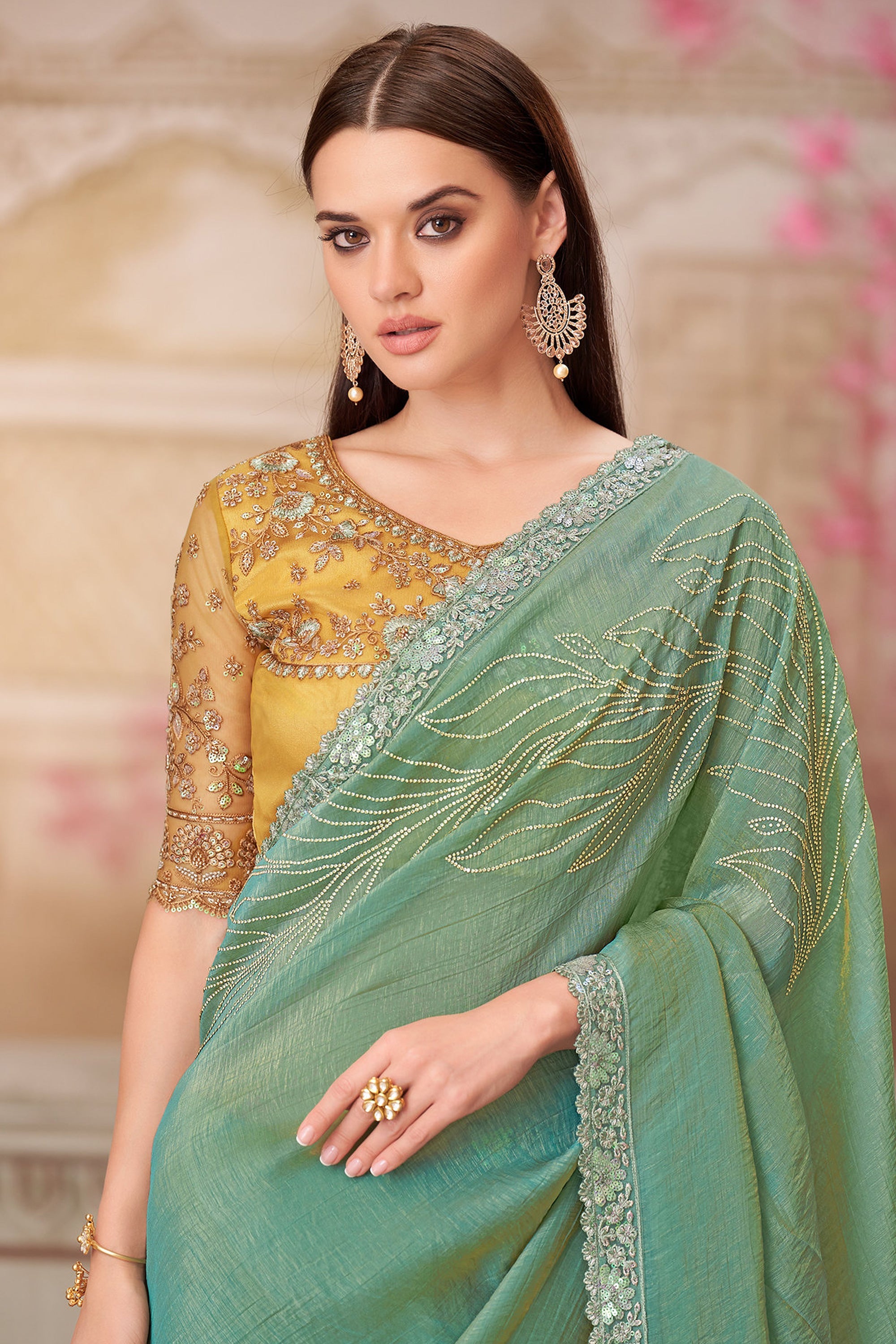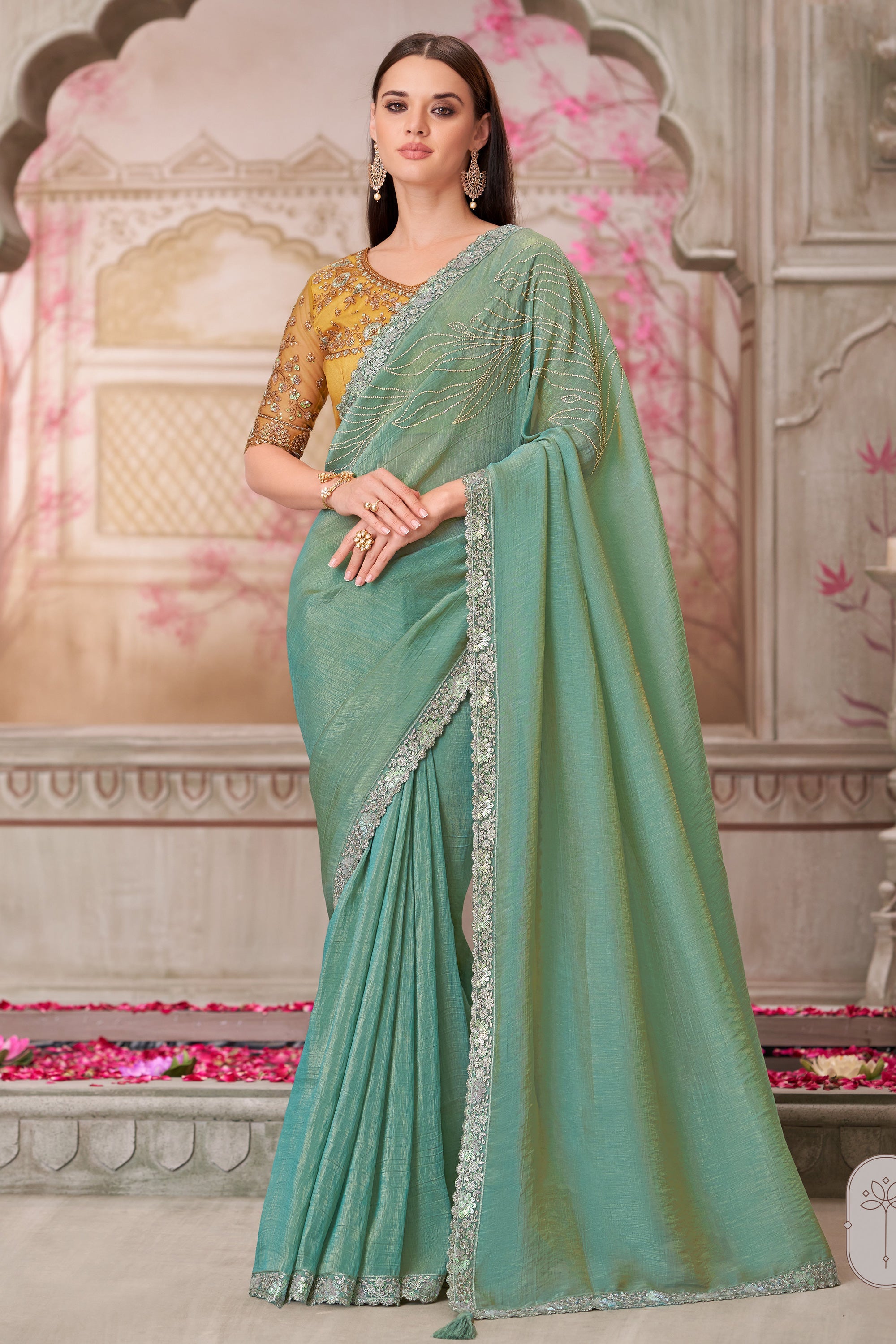 Satin Silk Party Style Luxurious Lace Border Work Saree In Sea Green Color