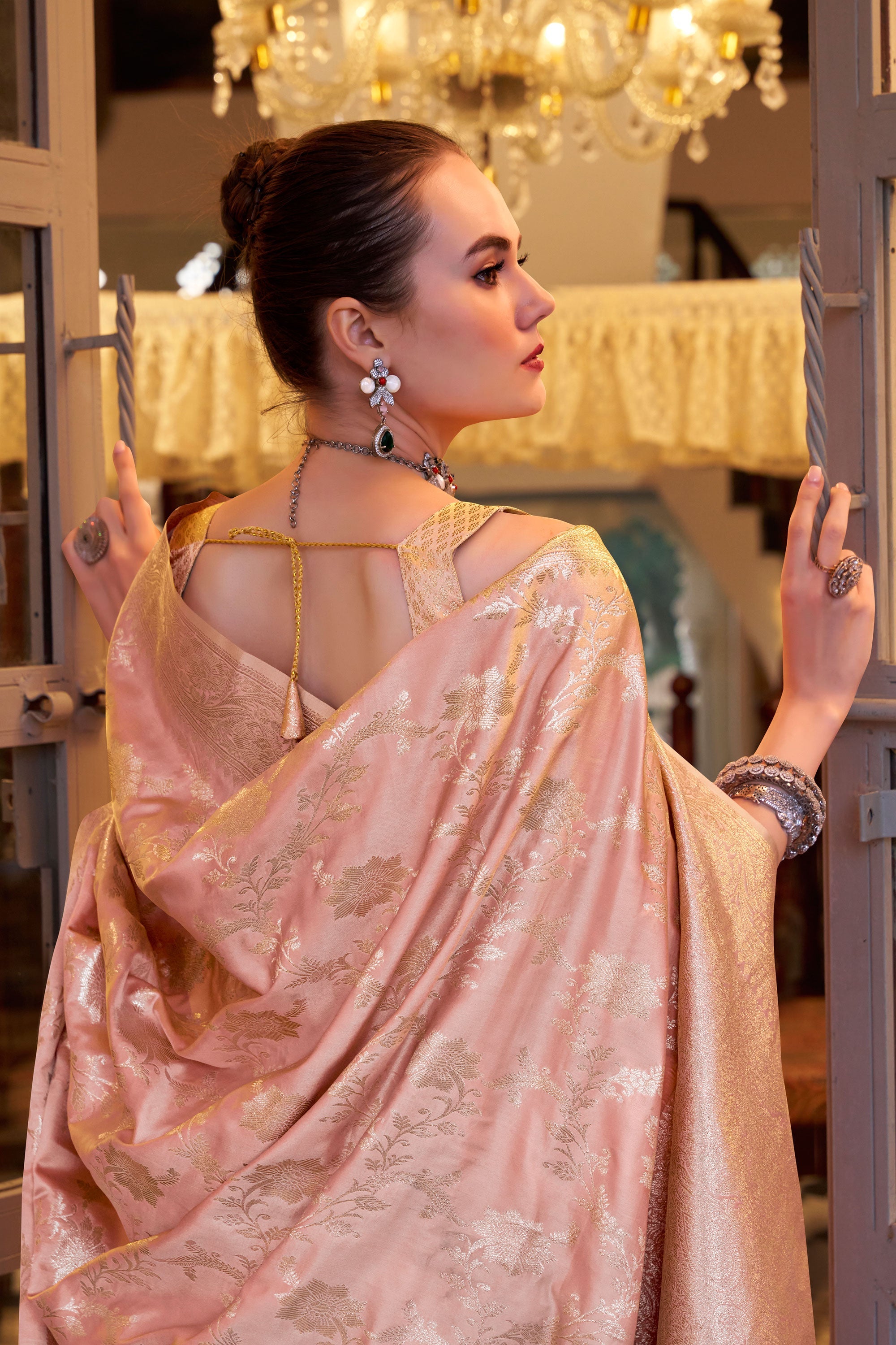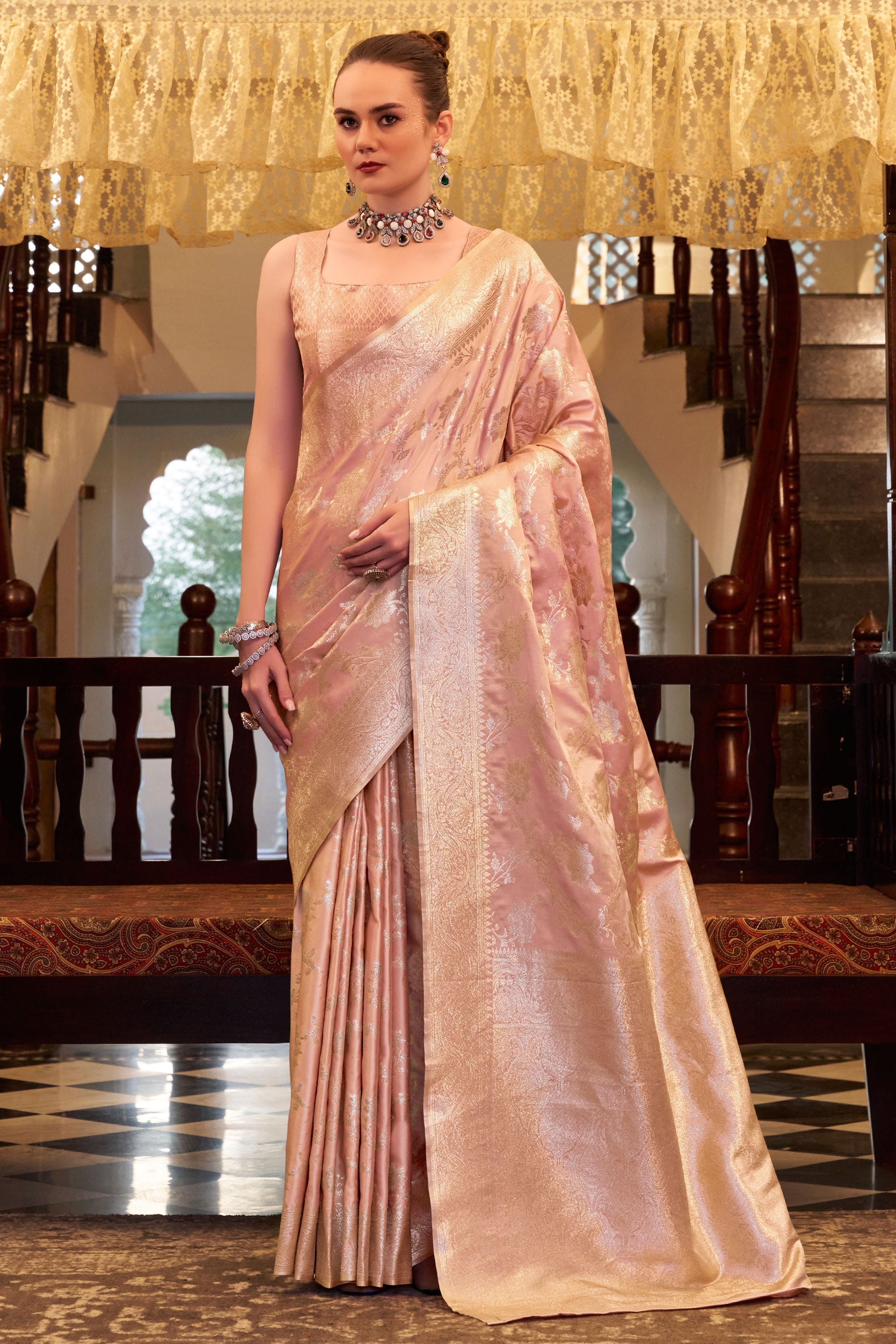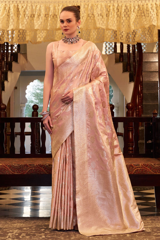 Satin Silk Zari Weaving Work Saree In Pink Color